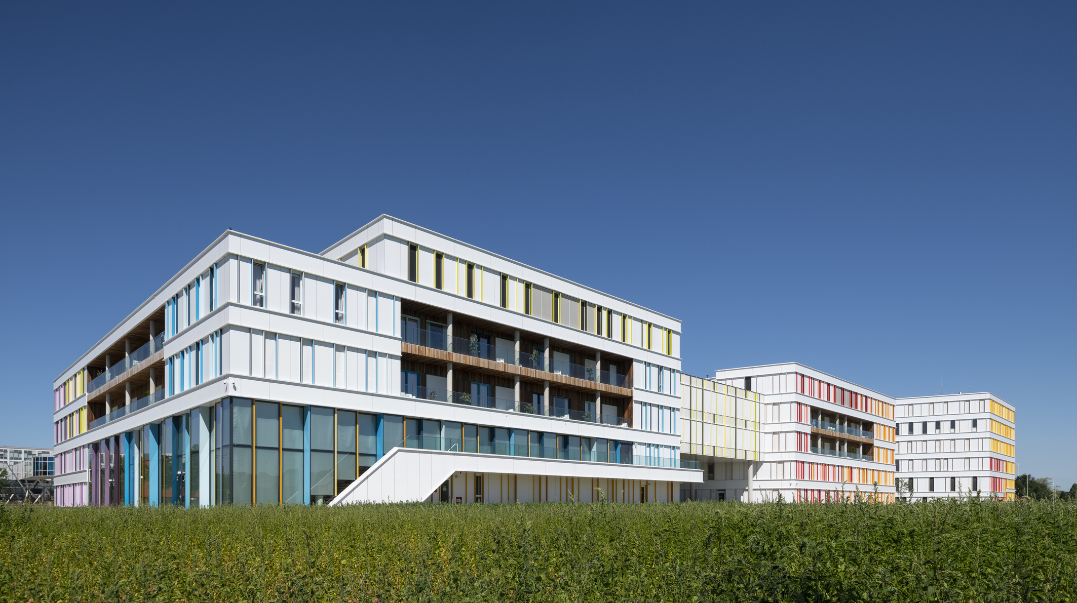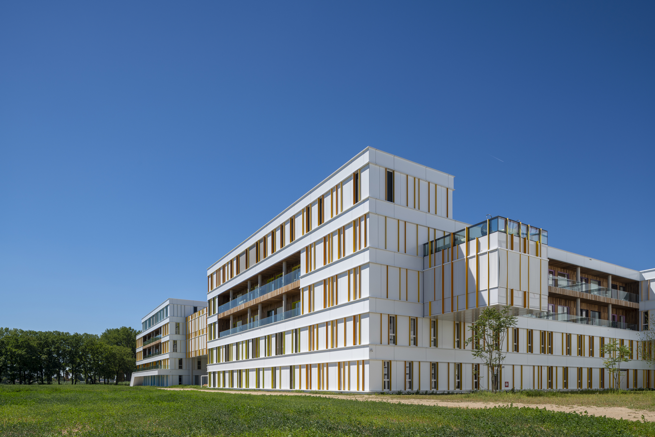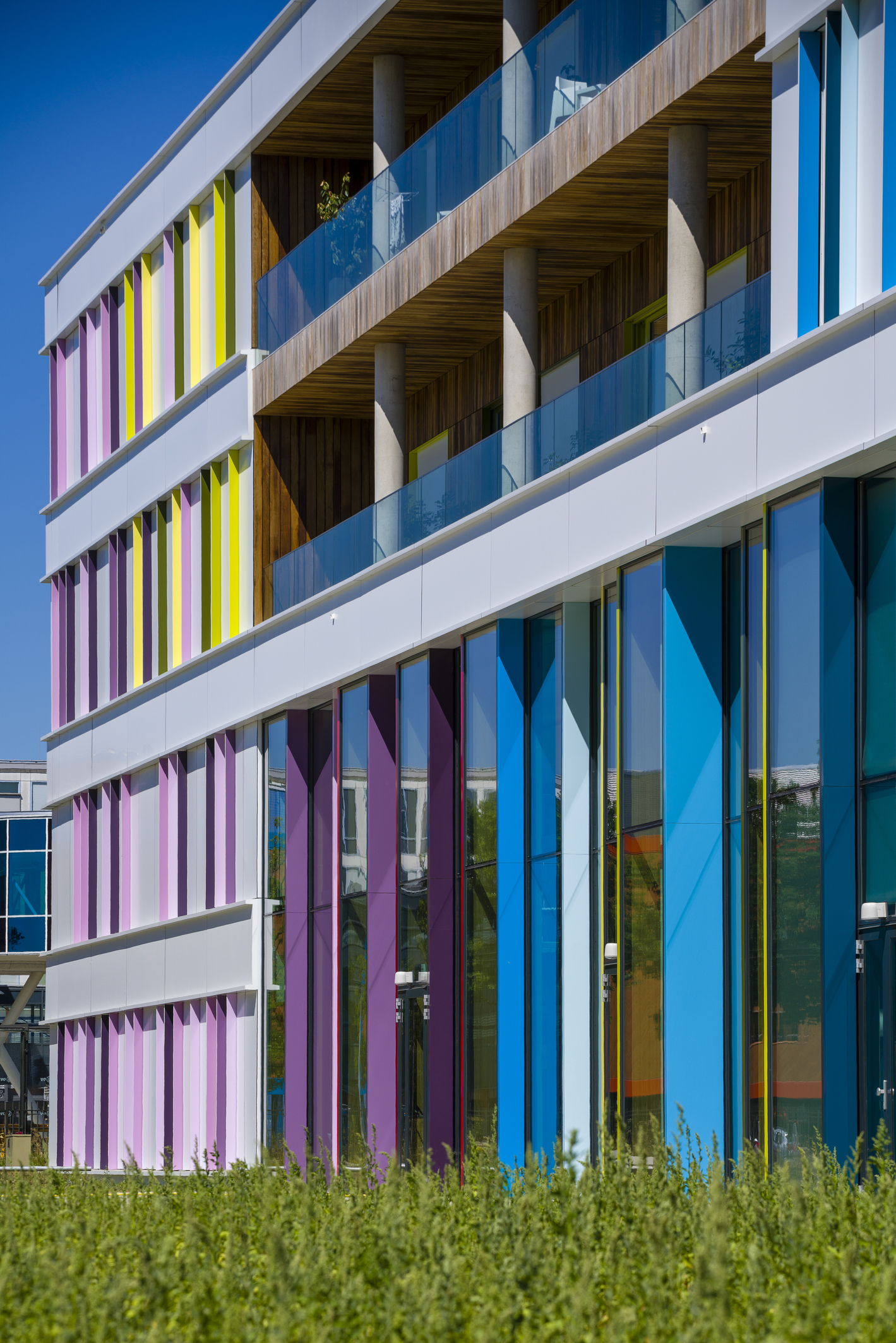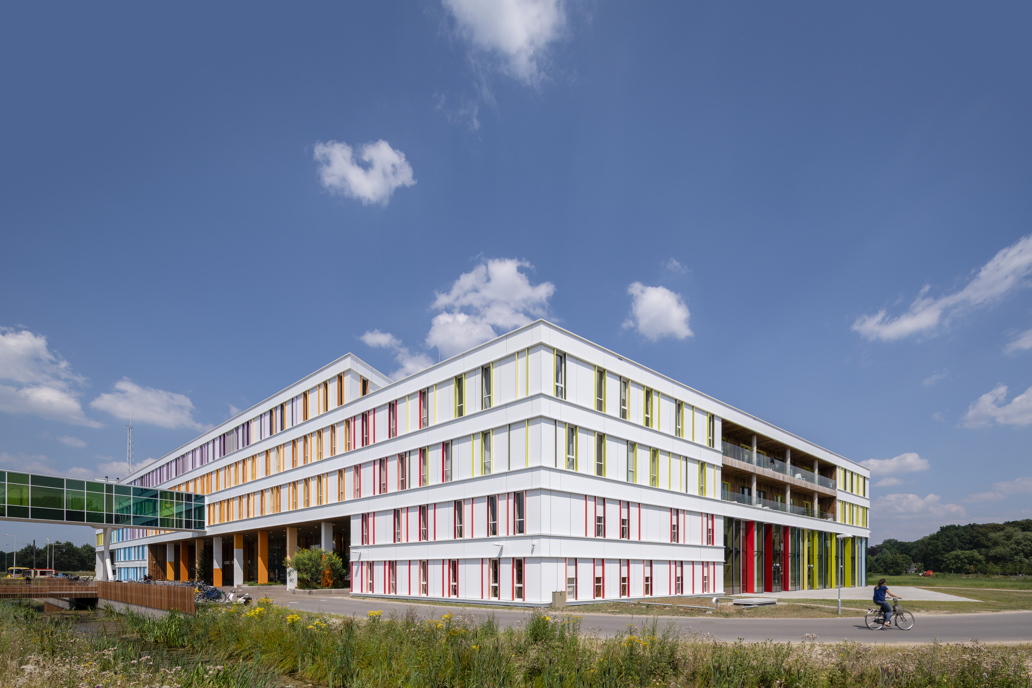 De vormgeving van het Prinses Máxima Centrum is voor kinderen herkenbaar: De witte gevel verwijst naar de witte jassen die de medische professionals dragen. De gekleurde, verticale banden – die refereren aan het wetenschappelijk onderzoek dat hier (ook) plaatsvindt, zoals het analyseren van DNA – maakt de façade dynamisch. Het vrolijke gevelbeeld prikkelt bovendien hun nieuwsgierigheid: Dit aanzicht verandert continu en is afhankelijk van hun positie ten opzichte van het gebouw.