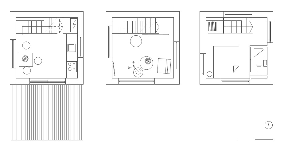 De inhoudelijke organisatie van de drie woonlagen is gebaseerd op de drie basiswoonfuncties: koken en eten op de begane grond, wonen en ontspannen op de eerste verdieping, slapen en verzorgen op de tweede verdieping. Iedere etage heeft een apart karakter. De etages worden verbonden door een in de trap geïntegreerde (boeken)kast. Ook de schuifpanelen, die de ruimtes ten behoeve van klimaat of privacy kunnen afsluiten, zijn in de trap geïntegreerd. Trap, kast en panelen vormen een functioneel, maar ook sculpturaal, geheel.