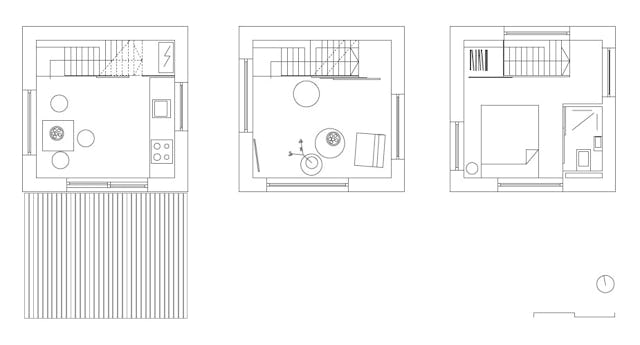 Simpele ontwerpkeuzes getuigen van creativiteit ten opzichte van duurzaamheid en kostenbesparing. Vaak zien we bij grondgebonden tiny huisjes dat - door ruimtegebrek – qua afmeting aangepaste, kostbare, onderdelen noodzakelijk zijn. Bij Slim Fit zijn keukenblok, sanitair en eventuele losse meubels qua afmeting standaard. De verticale aansluiting is ondanks de zeer compacte voetprint van de woning eveneens door een standaard vurenhouten trap opgelost. De overige interieurelementen, zoals de (boeken)planken die met de trap zijn geïntegreerd en de opgebouwde schuifpanelen die de ruimtes afsluiten, zijn van berken triplex opgebouwd of afgewerkt.