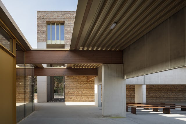 De drie hoofdvolumes van de site – het crematiegebouw, het afscheidsgebouw en het horecagebouw - liggen gegroepeerd rondom een centrale buitenkamer. Deze buitenruimte wordt beschouwd als een “Campo Santo”, een heilige plek. Het is een plaats voor rust en beschouwing. Door de laaghangende rand van de wandeling rondom dit atrium zie je enkel de stammen van de bomen en wat zich op de grond afspeelt.
