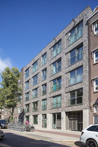 De geluidsbelaste voorgevel bestaat uit grote metselwerk kaders, de gevel op de begane grond is opgetrokken in natuursteen. De Wasserstrich baksteen is zowel liggend als staand verwerkt in een halfsteens blokverband, die in de penanten liggend en in de borstweringen staand is toegepast. Het metselwerk onderscheid zich subtiel van de omgevende gevels en refereert aan de Amsterdamse school, kenmerkend voor deze buurt.