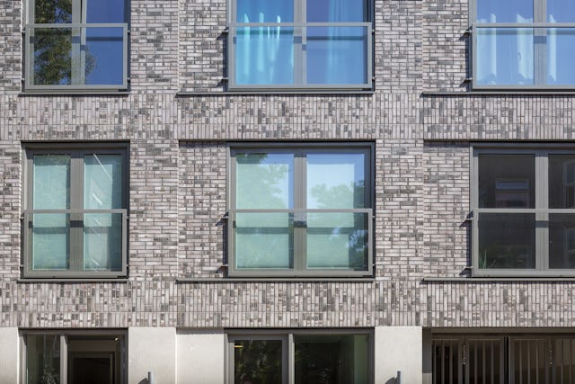 Het raster van grote vierkanten met verdiepte ramen op een plintgevel is geïnspireerd op de gevelopbouw van het voormalige pand.