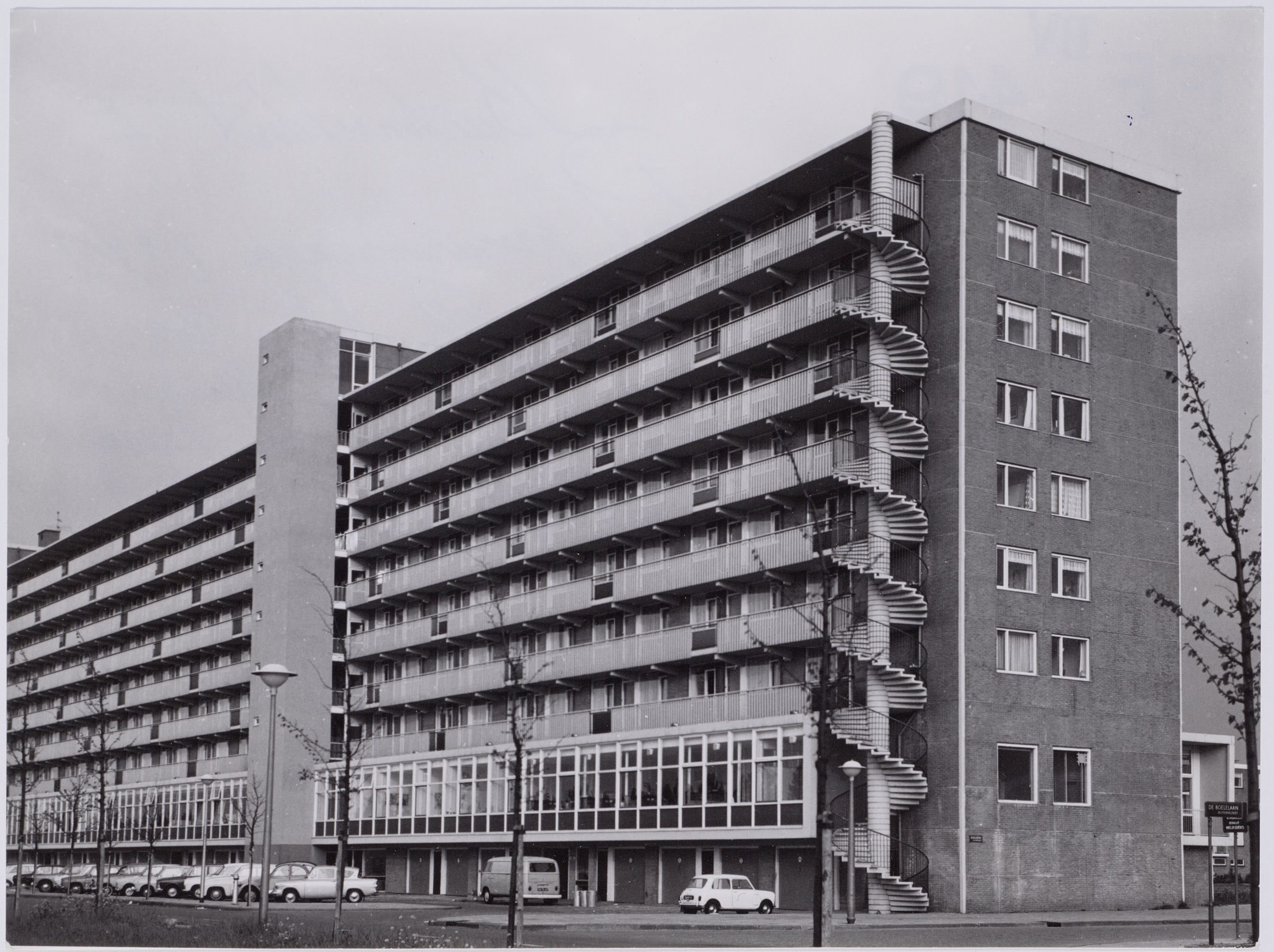 De garageboxen op de begane grond zijn omgebouwd tot stalling voor elektrische auto’s. De bewoners en medewerkers van De Boel delen tien BMW i3’s als onderdeel van het duurzame Share and Create mobiliteitsconcept. De glazen deuren maken dit zichtbaar en zorgen voor een levendige gevel.