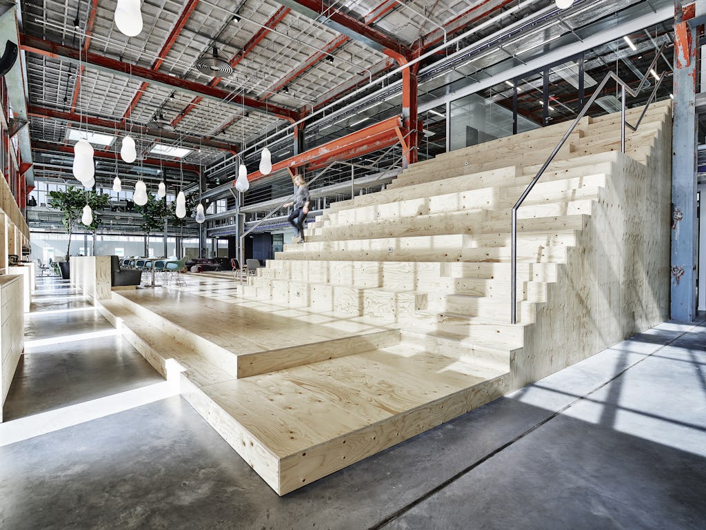 Het verhoogde houten plateau creëert een meer intieme sfeer voor informele werkplekken. Het plateau gaat naadloos over in een trap, die tevens functioneert als tribune voor lezingen en andere evenementen.