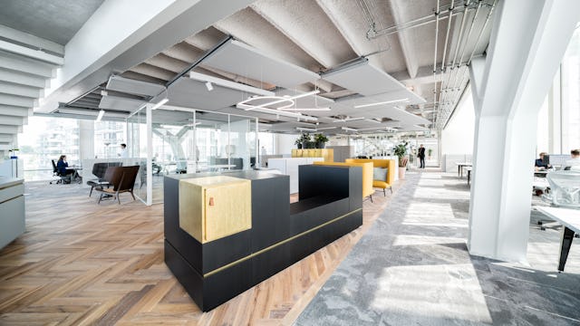 Toelichting: FIRM architects - Het begint al bij de entree als je het pand binnenkomt, stap je in een lift. Maar dit is eigenlijk geen lift. Het is een woonkamer, compleet met planten en een eiken vloer, die je naar de juiste verdieping brengt. Al rijzend kijk je uit over het water. Dit wordt versterkt doordat de lift bewust traag is gemaakt. Belangrijk effect van deze keuze is dat hiermee voor de medewerkers juist het gebruik van de centrale trap wordt gestimuleerd. Hiermee beweging en interactie benadrukkend.