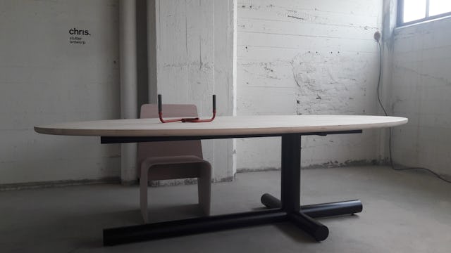 Tafel Tom kenmerkt zich door zijn stoere onderstel dat bestaat uit ronde stalen buis waarbij de middenpoot asymmetrisch is geplaatst. Chris tracht met dit onderstel voor een ieder herkenning op te roepen, herkenning vanuit de brug- en waterbouw en zijn liefde voor de maritieme wereld. Door het asymetrische plaatsen van de staande middenpoot krijgt de tafel dynamiek, tevens geeft hij hiermee richting aan in het interieur, dit zijn facetten die Chris graag laat zien in zijn ontwerp.