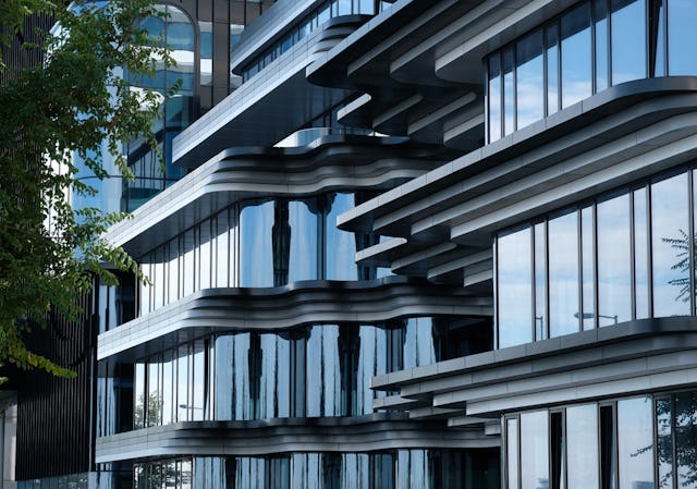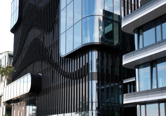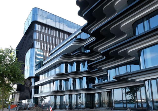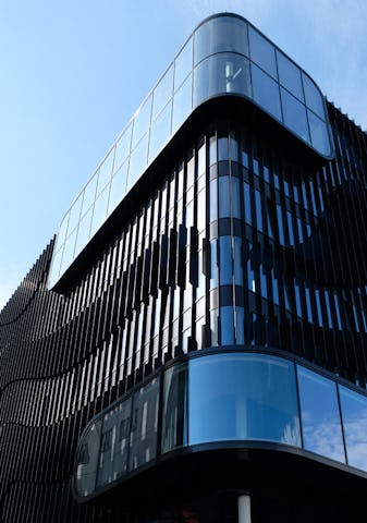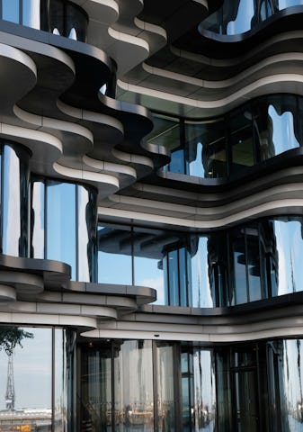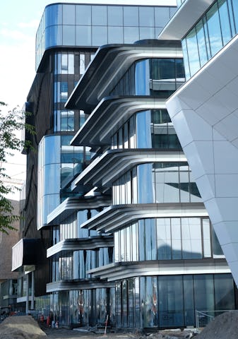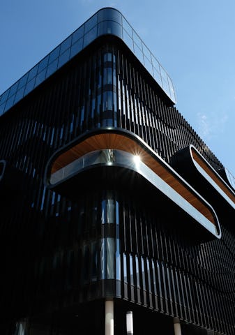Voor het derde gebouw kozen we vanwege het evenwicht weer voor hoogbouw. Deze tien verdiepingen tellende constructie is gebaseerd op een futuristische visie, met enorme asymmetrische openingen en uit het pand stekende glazen ruimtes met uitzicht op het IJ en de stad. Door deze openingen op de rand van het gebouw te plaatsen zorgden we ervoor dat het grafische element van de gevel, waarbij sculpturale lamellen de golfbewegingen belichamen, centraal kwam te staan.