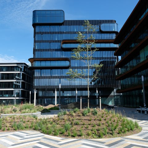 Bij het middelste gebouw, de sociale hub van de campus, is gekozen voor laagbouw. De gelaagde, organische vormen zijn geïnspireerd op een waterval. Vloeiende lijnen en een sensueel gebogen rimpeling in het glasoppervlak geven op spectaculaire wijze vorm aan de hoofdingang. Dit vier verdiepingen tellende gebouw is een centrale ontmoetingsplaats voor ieder die op de campus werkzaam is. Daarom is er gekozen voor een uitnodigende, horizontale dynamiek en een ruim licht-overgoten atrium in het hart.