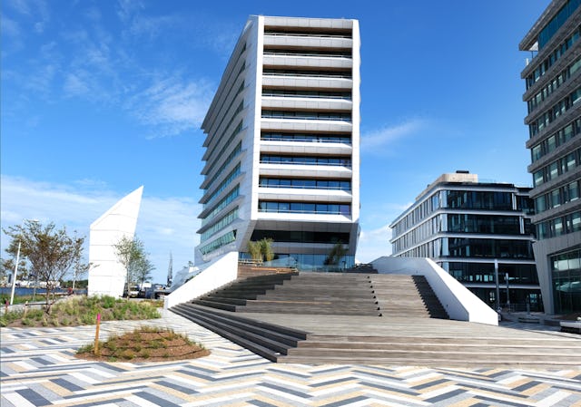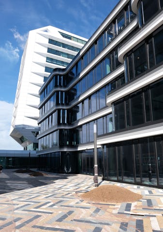 PVH Europe HQ (https://mvsa-architects.com/project/projects-pvh-europe-hq-offices/) is het eerste gebouw en het fundament van de campus. Hierin is het Europese hoofdkwartier van Calvin Klein en Tommy Hilfiger is gevestigd. Dit 12 verdiepingen hoge gebouw heeft de langgerekte lijnen en glanzende afwerking van een luxe jacht. De hoogte en de iconische vorm van het gebouw verlenen aan de campus herkenbare aanwezigheid, identiteit en karakter.