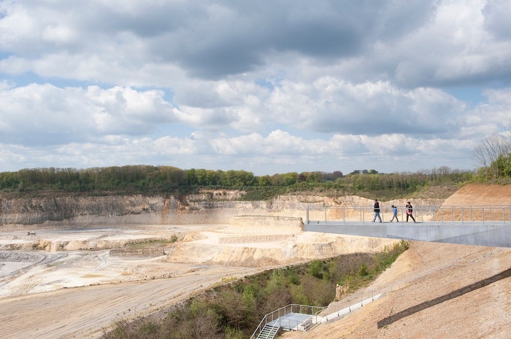 Op weg naar het platform dat een panoramisch uitzicht biedt over de groeve loopt de bezoeker eerst langs een betonnen muur en door het bos. Het platform is symbolisch uitgelijnt met de oude weg van Maastrischt naar Luik: de Luikerweg. Wanneer de drooglegging is voltooit zal die weg weer volledig functioneren.