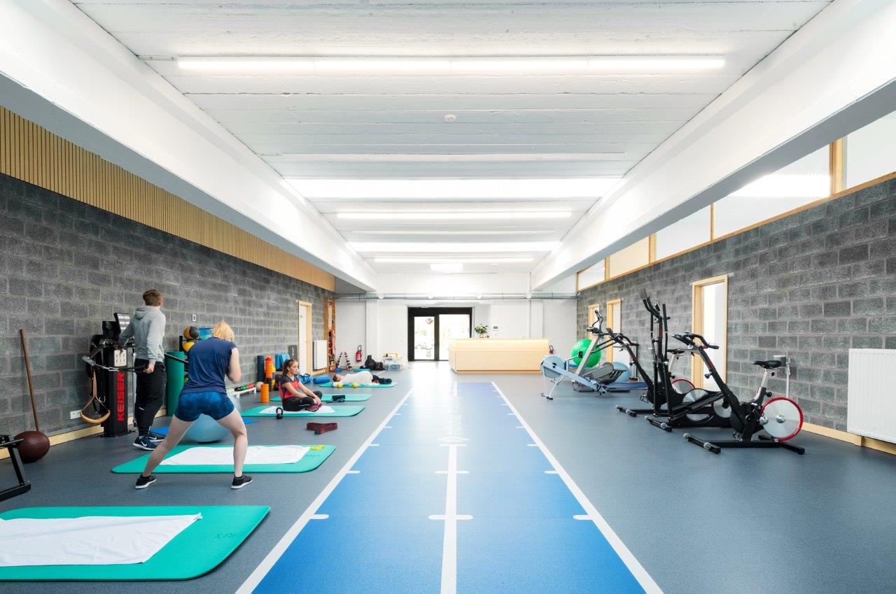 Toelichting Polygoon Architectuur - Het architectenbureau verwijderde alle binnenmuren en maakte zo de structuur van de ruimte zichtbaar. De basisstructuur was immers eenvoudig en symmetrisch, met twee zware betonnen balken die het dak schragen. Centraal staat de grote oefenzaal. Links ervan liggen behandelruimtes, rechts kleedkamers, douches en personeelsruimtes.