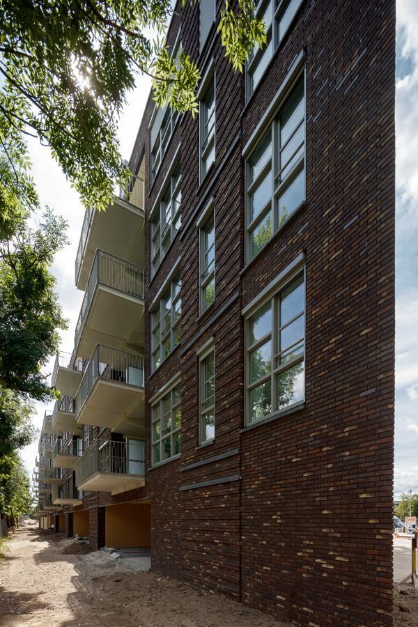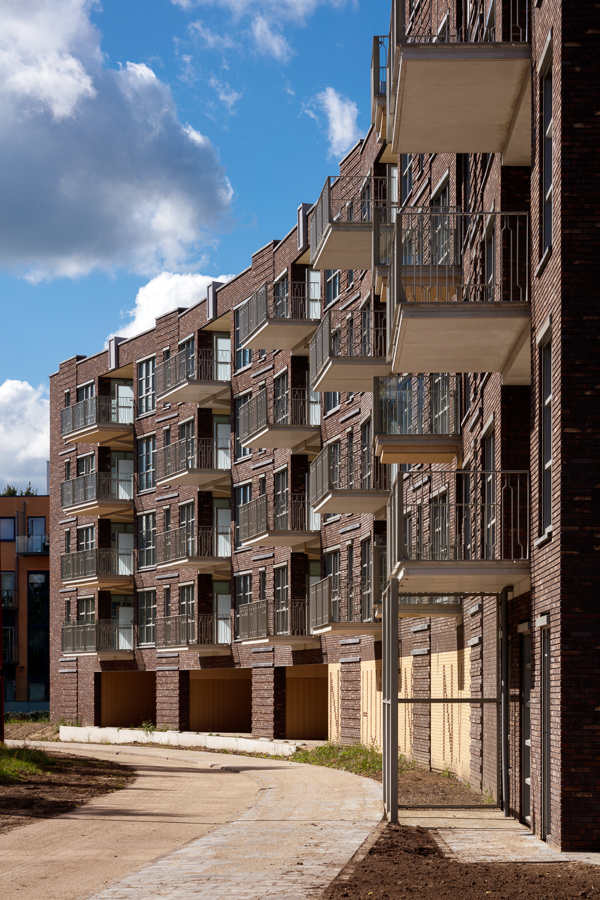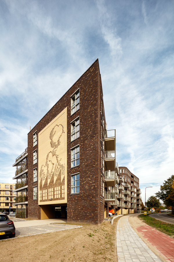 De binnenzijde is open en hier draait de kleurstelling zich om; waar de buitengevels overwegend donkerbruin en her en der licht zandkleurig geaccentueerd zijn, zijn de binnengevels van de twee lange hoofdvolumes zandkleurig met afwisselend een donker accent. De driehoekig gevormde trappenhuizen zijn begroeid met Hedera; met hun vorm en groene verschijning bieden ze bescherming en afscherming. Samen met de scherpe schuine kopgevels maken ze de richting van het oorspronkelijke slagenlandschap zichtbaar.