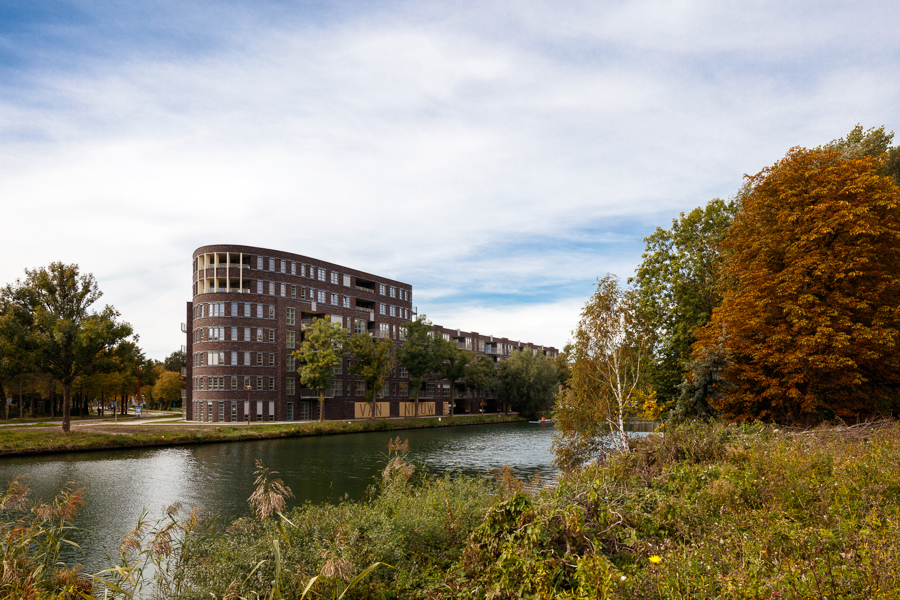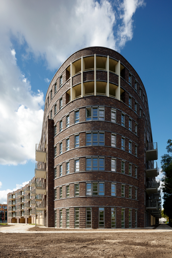 Alle volumes vormen gezamenlijk een eenheid die zich aan elke zijde gemakkelijk plooit naar zijn omgeving. De twee lange hoofdvolumes links en rechts vinden elkaar via de verhoogde kop. Deze ronde kop is als de boeg van een schip; het verbindt bakboord en stuurboord, geeft de koers aan en splitst het water. Zo ook als stedenbouwkundig accent; de verhoogde ronde kop benadrukt de splitsing tussen het straatprofiel en het water, steekt fier haar hoofd omhoog en begeleidt vervolgens zowel weg als water. Het centraal gelegen atrium met volledig glazen kap met een sterk ritmisch lijnenspel, is in stijl mee ontworpen en voorziet de woningen van een indrukwekkende en lichte toegang.