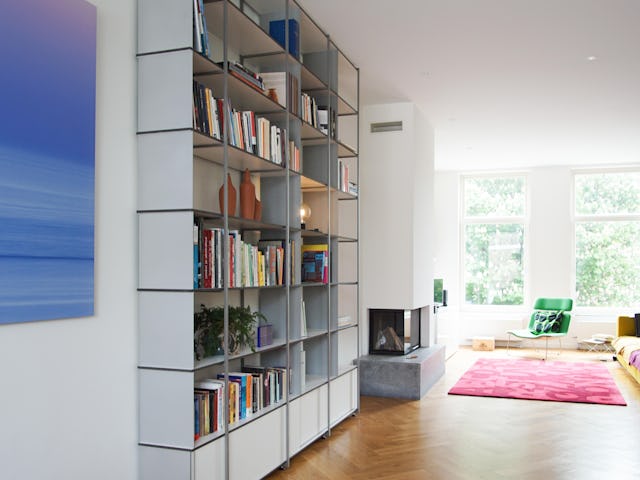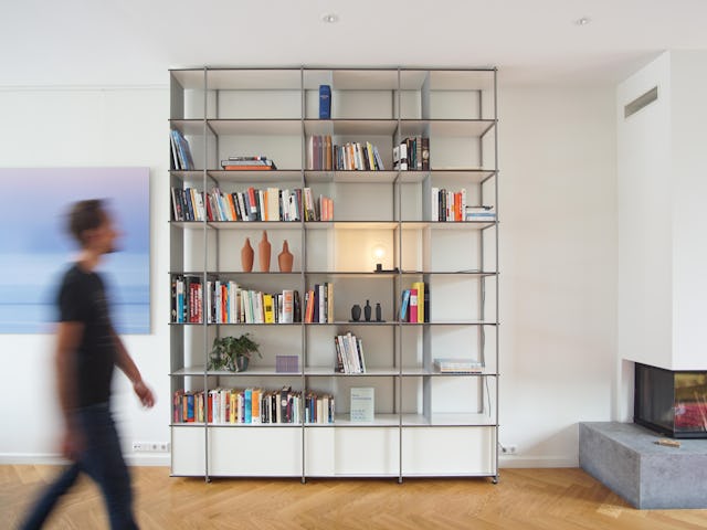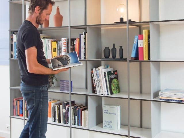 Door lijnen te frezen uit dit materiaal passen de planken precies in de 4 stalen frames van 14 mm, die per stuk met slecht 3 schroeven aan de muur bevestigd zijn. De freeslijnen maken het ook mogelijk om 3 mm dikke aluminium platen tussen de planken te schuiven die functioneren als boekensteun. Elke millimeter telt in deze maatwerk boekenkast, hoe langer je kijkt hoe meer je ontdekt. Een boekenkast die esthetisch en constructief het meeste uit het ontwerp halen.