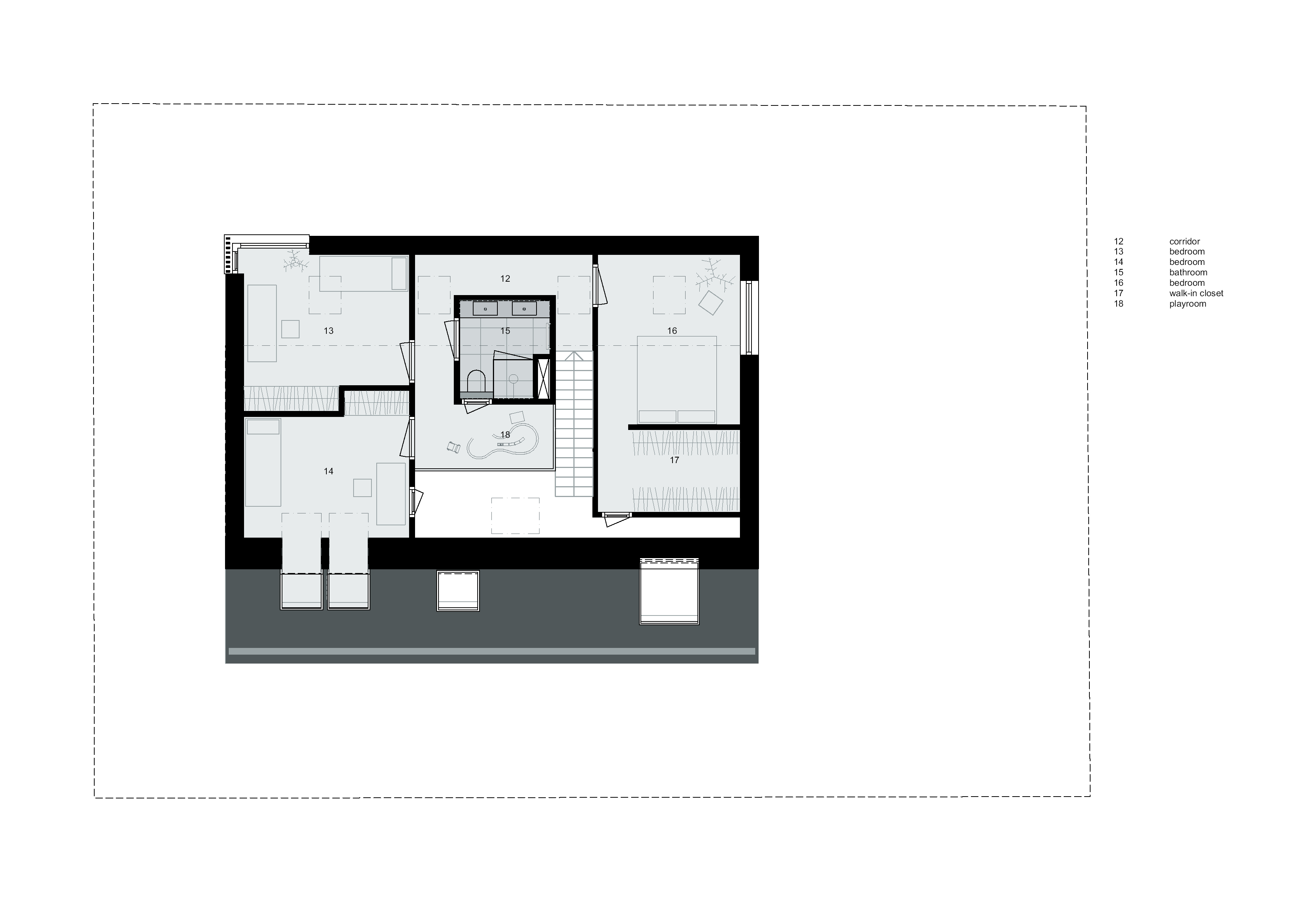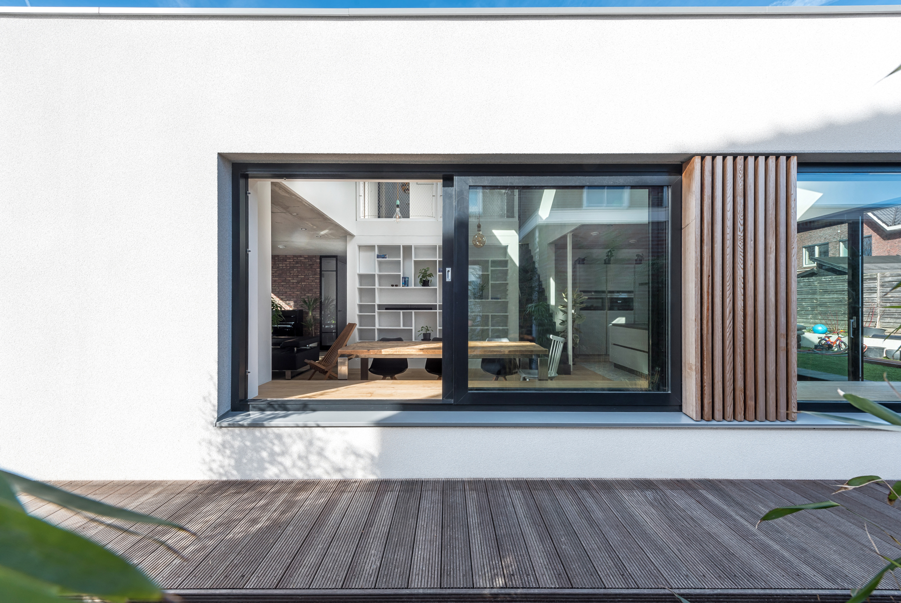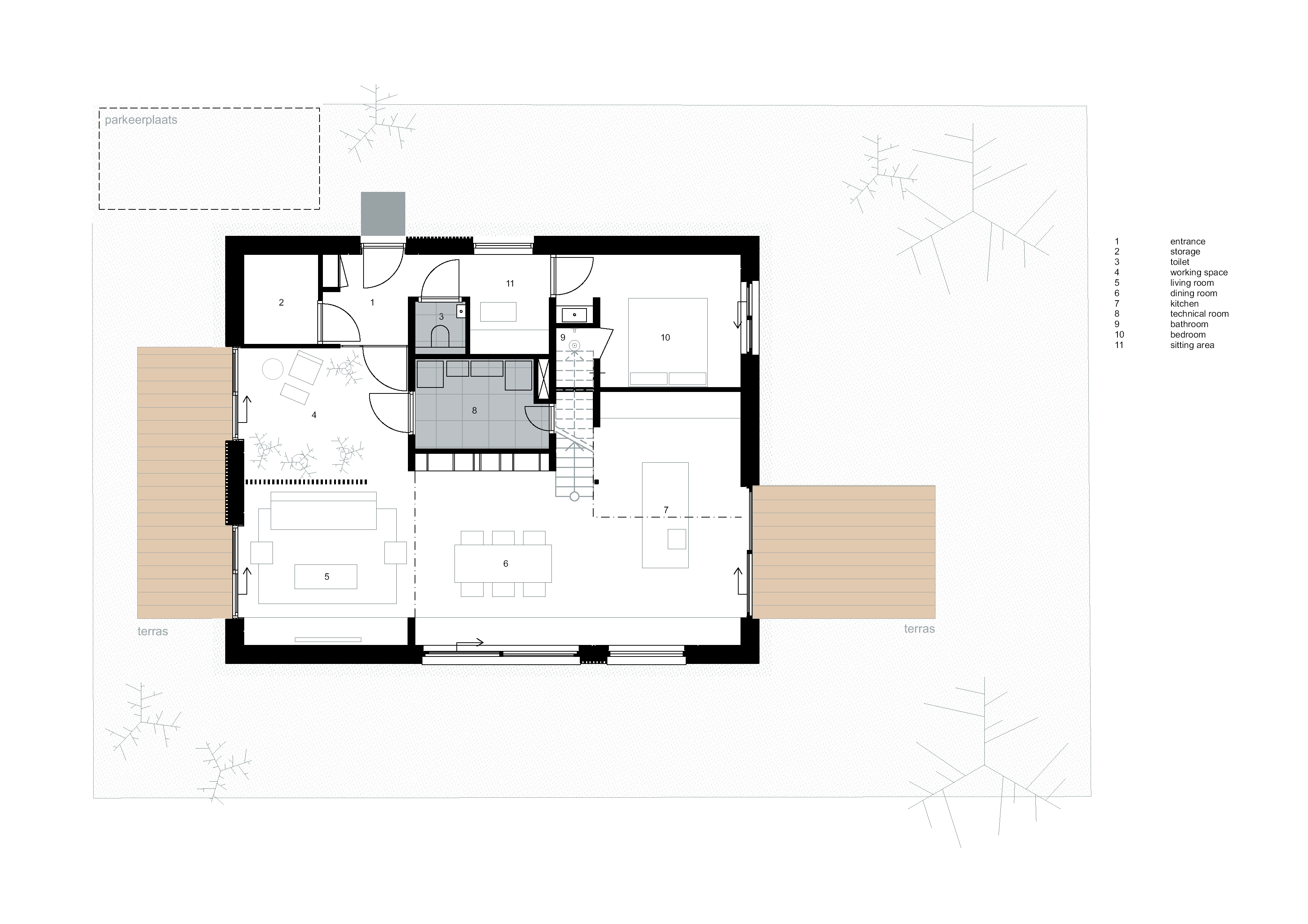 Omdat met regelmaat de grootouders van de kinderen voor langere tijd overkomen uit China is er gekozen om op de begane grond een logeerkamer met douche te maken. Deze logeerkamer is bewust niet gekoppeld met de centrale vide, zodat een meer privévertrek ontstaat die voorzien is van een eigen toegang tot de tuin. Indien de ouders in de toekomst beneden willen slapen is dit dus ook mogelijk. Hierdoor is de woning toekomstbestendig.