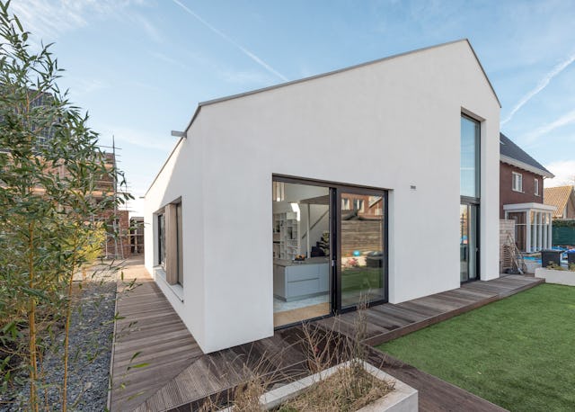 De woning is gebouwd met passieve bouwblokken, welke uitmuntend isoleren met een rc-waarde van 9. Als gevelbekleding is spuitkurk toegepast. Dit ecologisch verantwoorde product geeft de woning een eigentijdse uitstraling in combinatie met donkergrijze aluminium kozijnen met triple glas en vergrijsd houten lamellen van Western redcedar.
