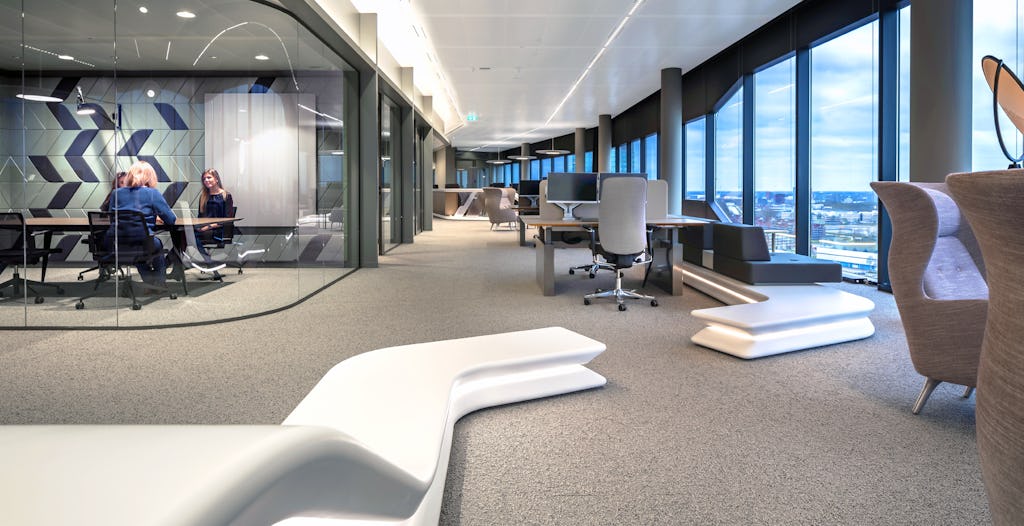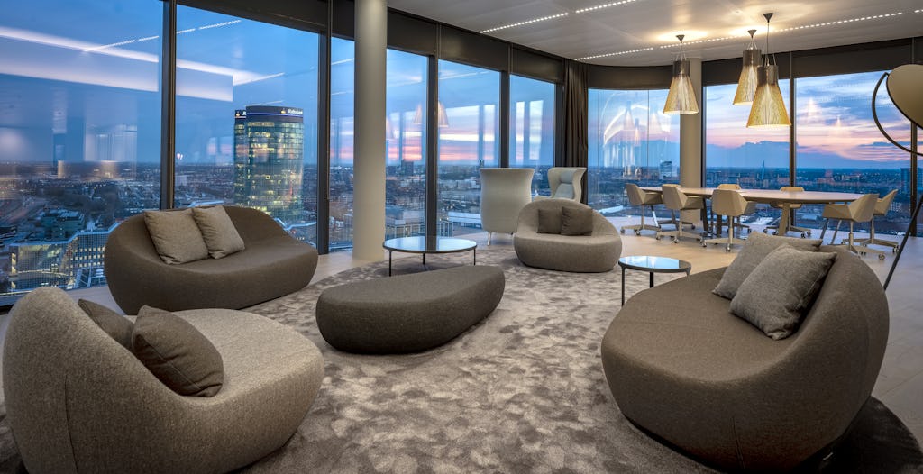 Toelichting Casper Schwarz Architects - Een werkvloer op de 18e verdieping midden in Utrecht, met grote ramen en een fenomenaal uitzicht. Vanaf het begin hadden wij een visie van een doorlopende loungevloer, waar werken, ontmoeten en ontspannen op een vrije wijze in elkaar overvloeien. Een plek waar je heel graag bent en waar je heerlijk kunt werken.