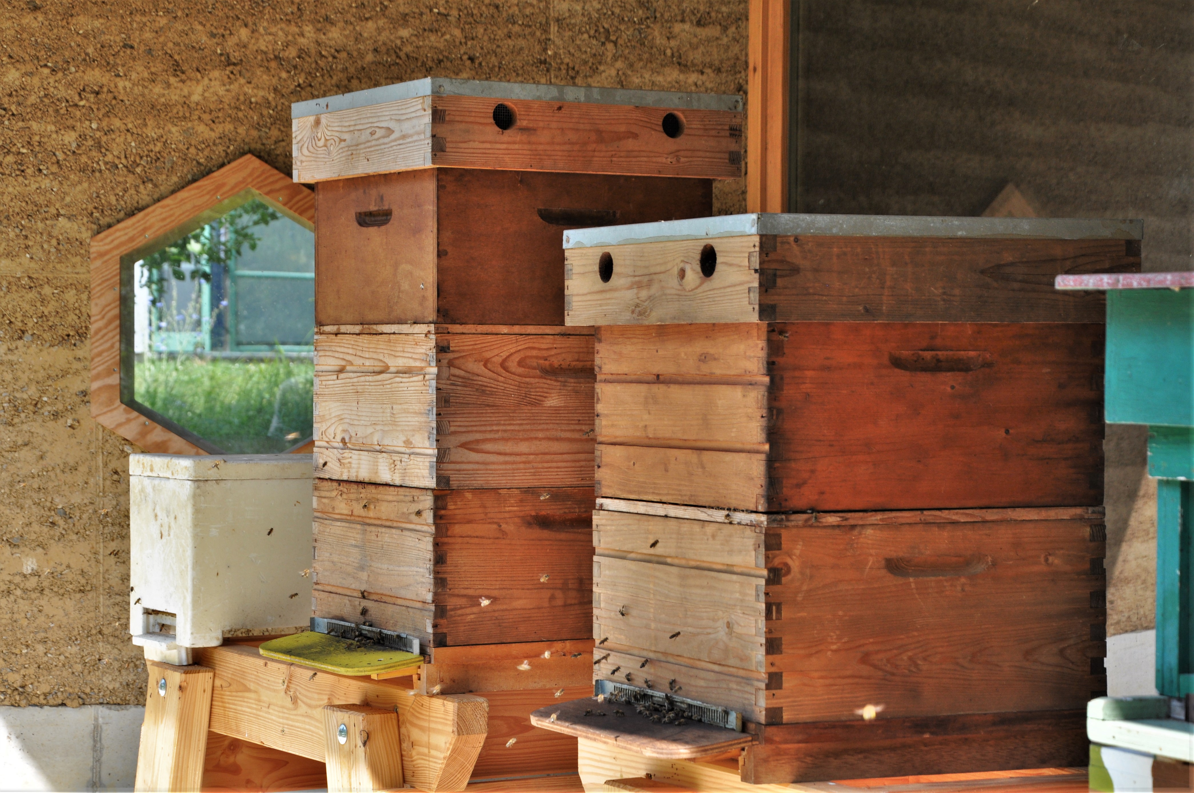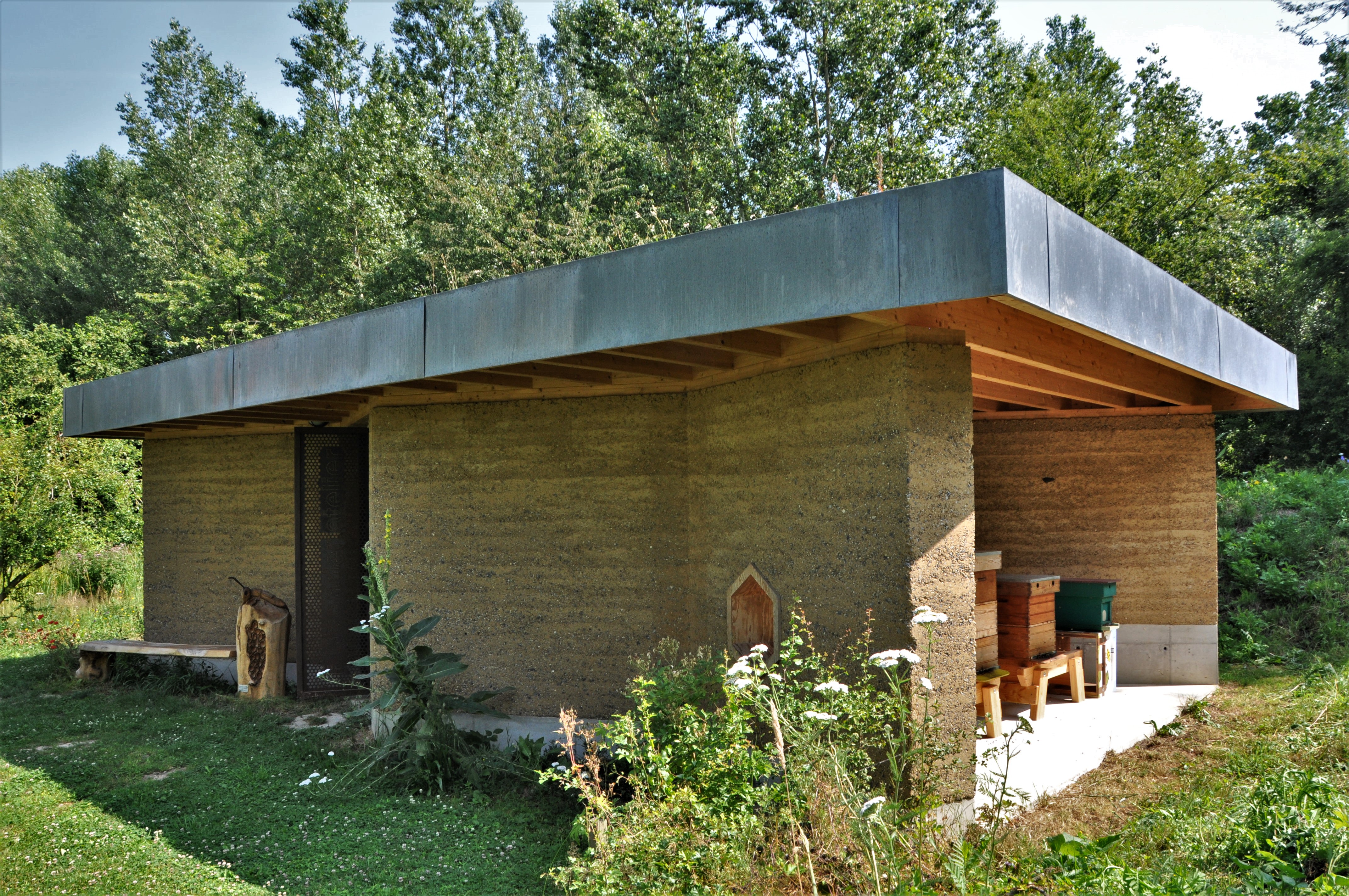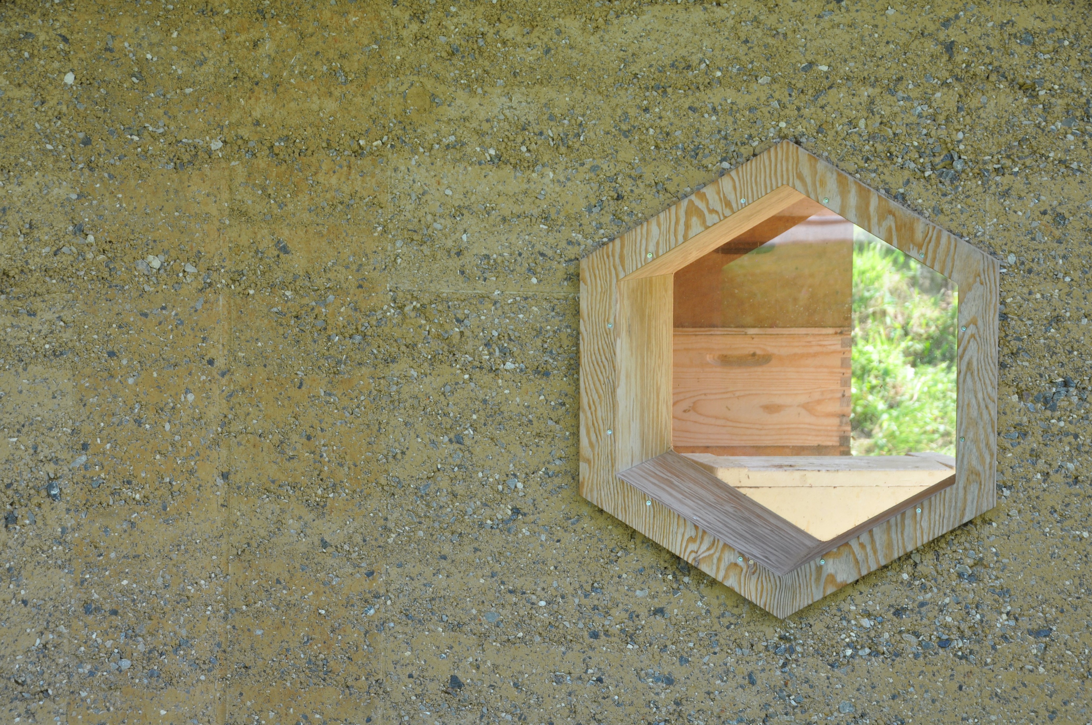 Ken Dupont van Dam Architecten “De leem werd ontgonnen op de site van het natuurdomein. We verwerkten er nog klei, zand en granulaten in en lieten vervolgens alles in de fabriek mengen. We hebben de verse, vochtige stampleem ter plaatse laag per laag in een stabiele bekisting gegoten en met een pneumatische hamer aangestampt. Dat was heel arbeidsintensief. Leem kan ook vlot ontkist worden. De milieu-impact is, in tegenstelling tot voor beton, nagenoeg nihil. Nadelige gevolgen, zoals schadelijke emissies, zijn er niet. Dat is goed voor de kwetsbare bijen”.