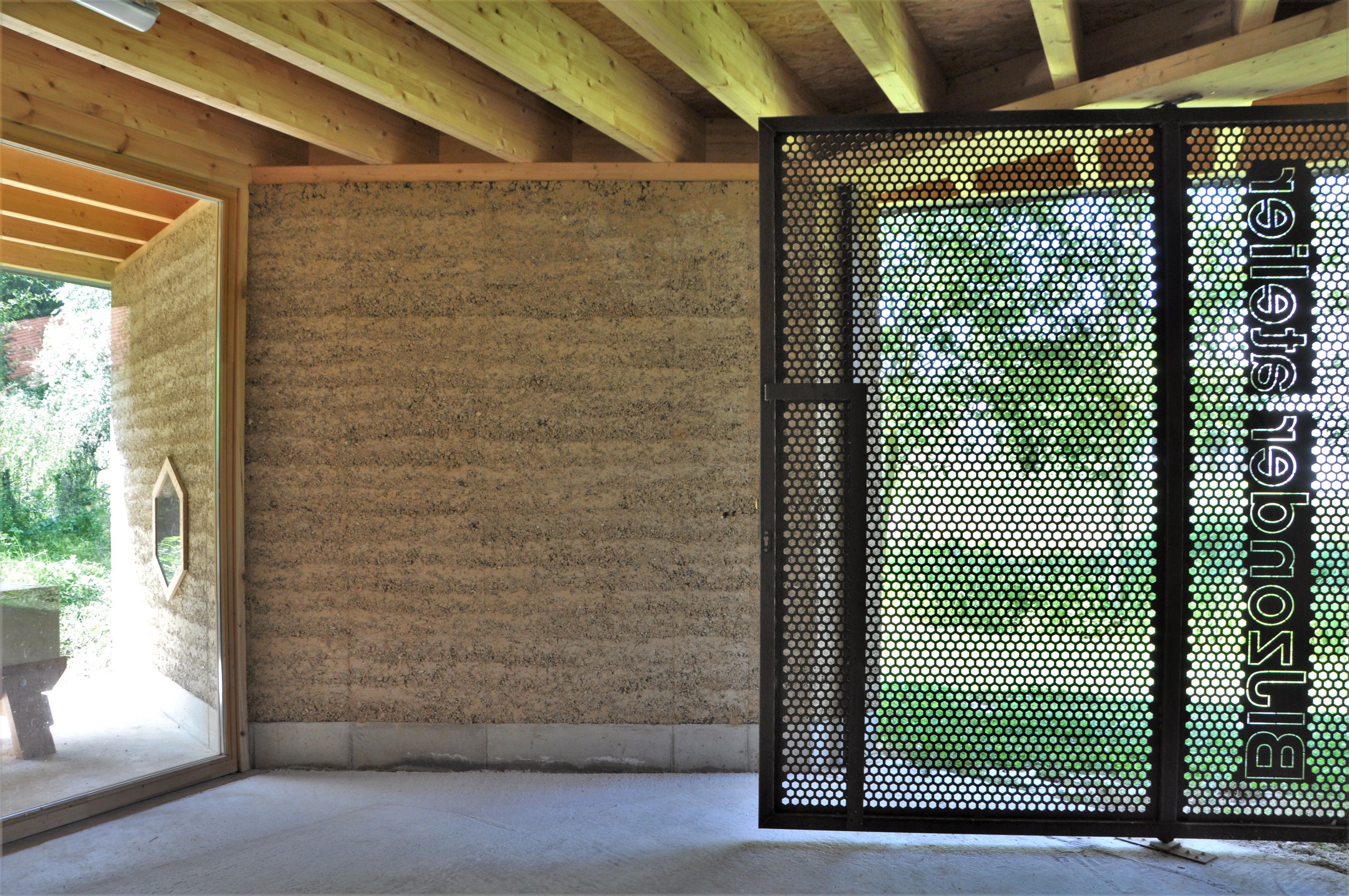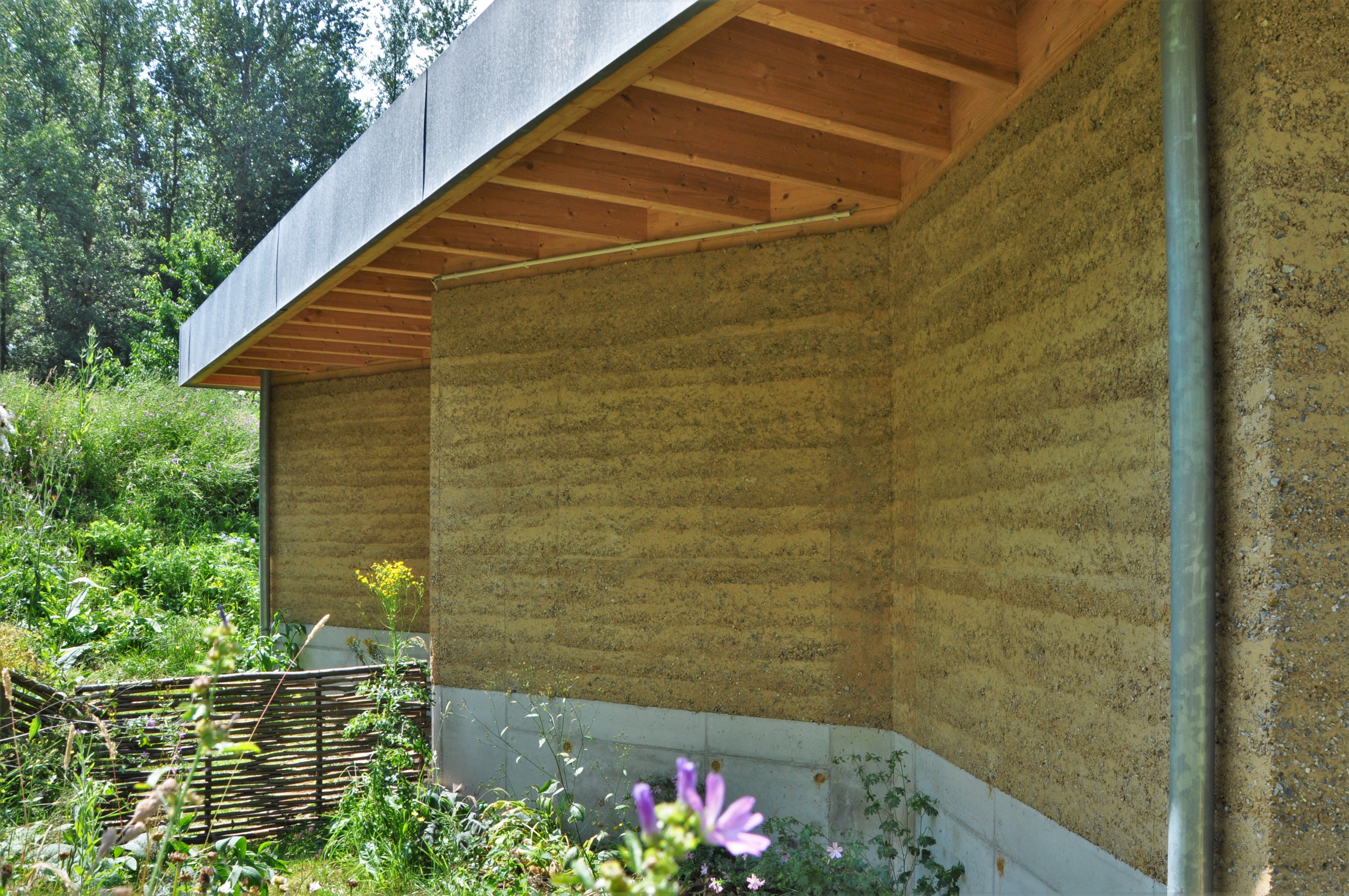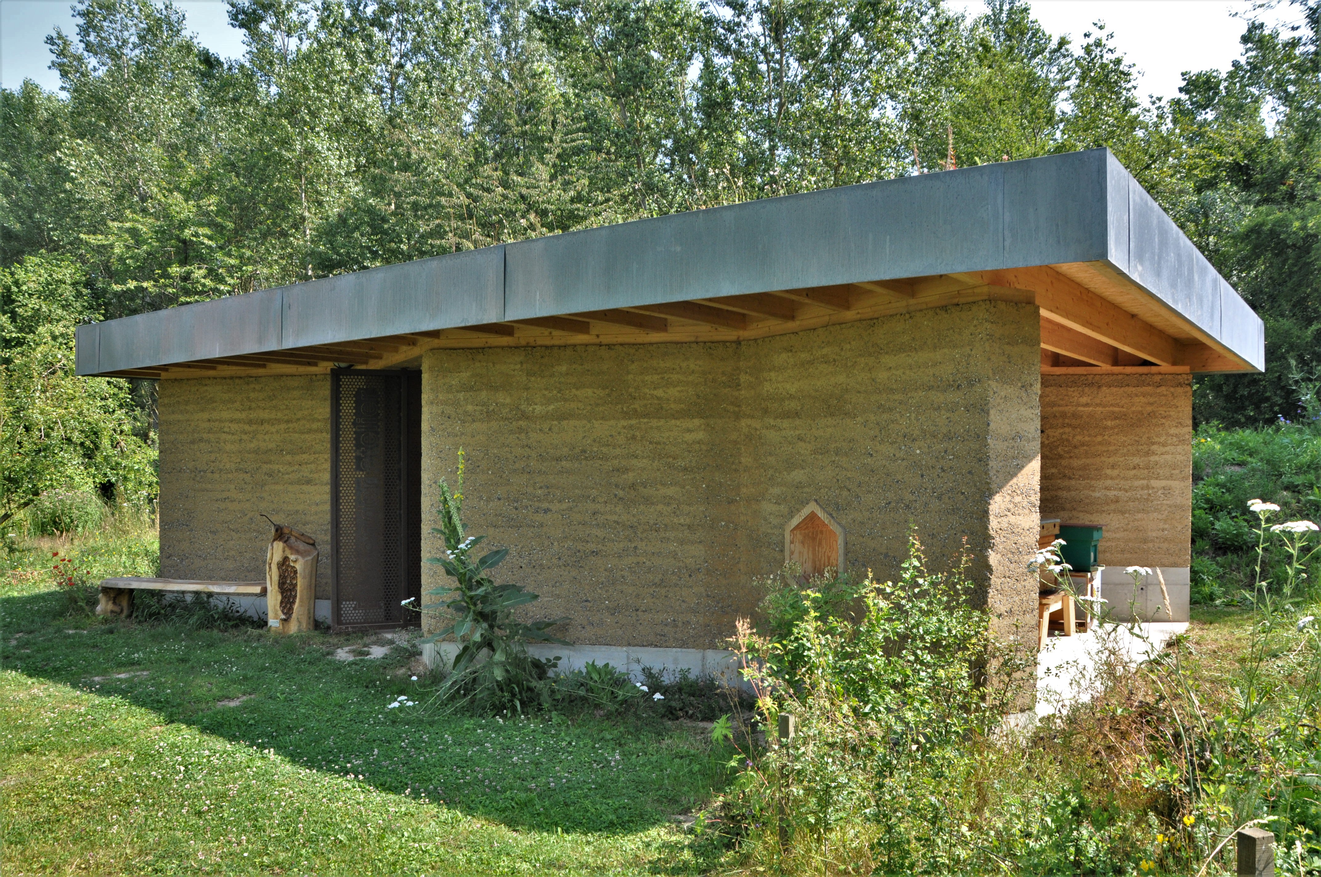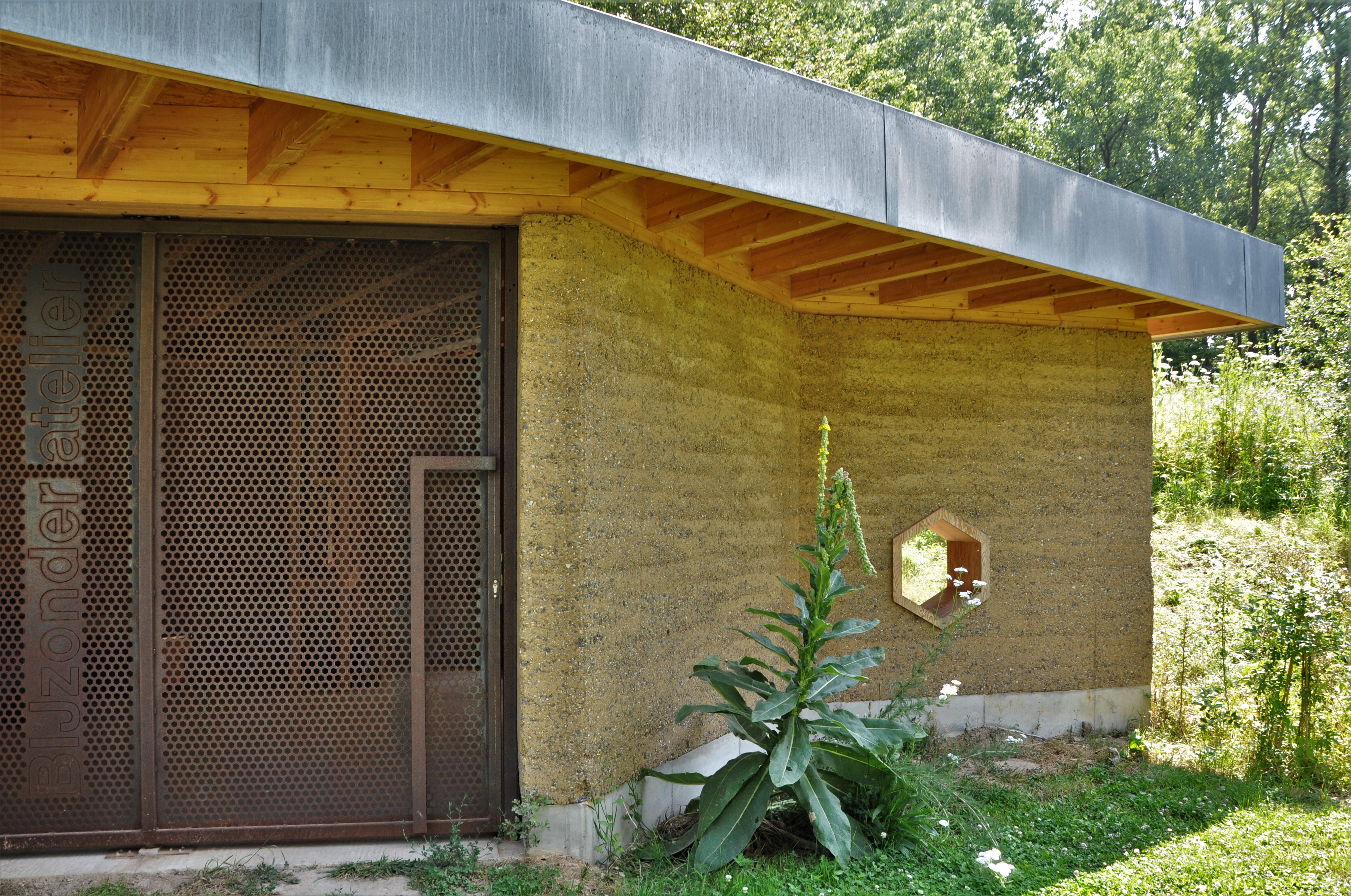 Alle materialen zijn bio-ecologisch. De lemen muren zijn 2,5 m hoog en 40 cm dik. Ken Dupont van Dam Architecten: “de muren zijn in zigzagvorm geplaatst, zoals bij een honingraat, om hun sterkte en draagkracht te verhogen. Er werd nog een cellulose coating op gezet”. De lemen muren dragen een houten dakgebint in gelamineerd vurenhout. Om de windbelasting op te vangen werd het dak met vier stangen verankerd in een betonnen constructie.