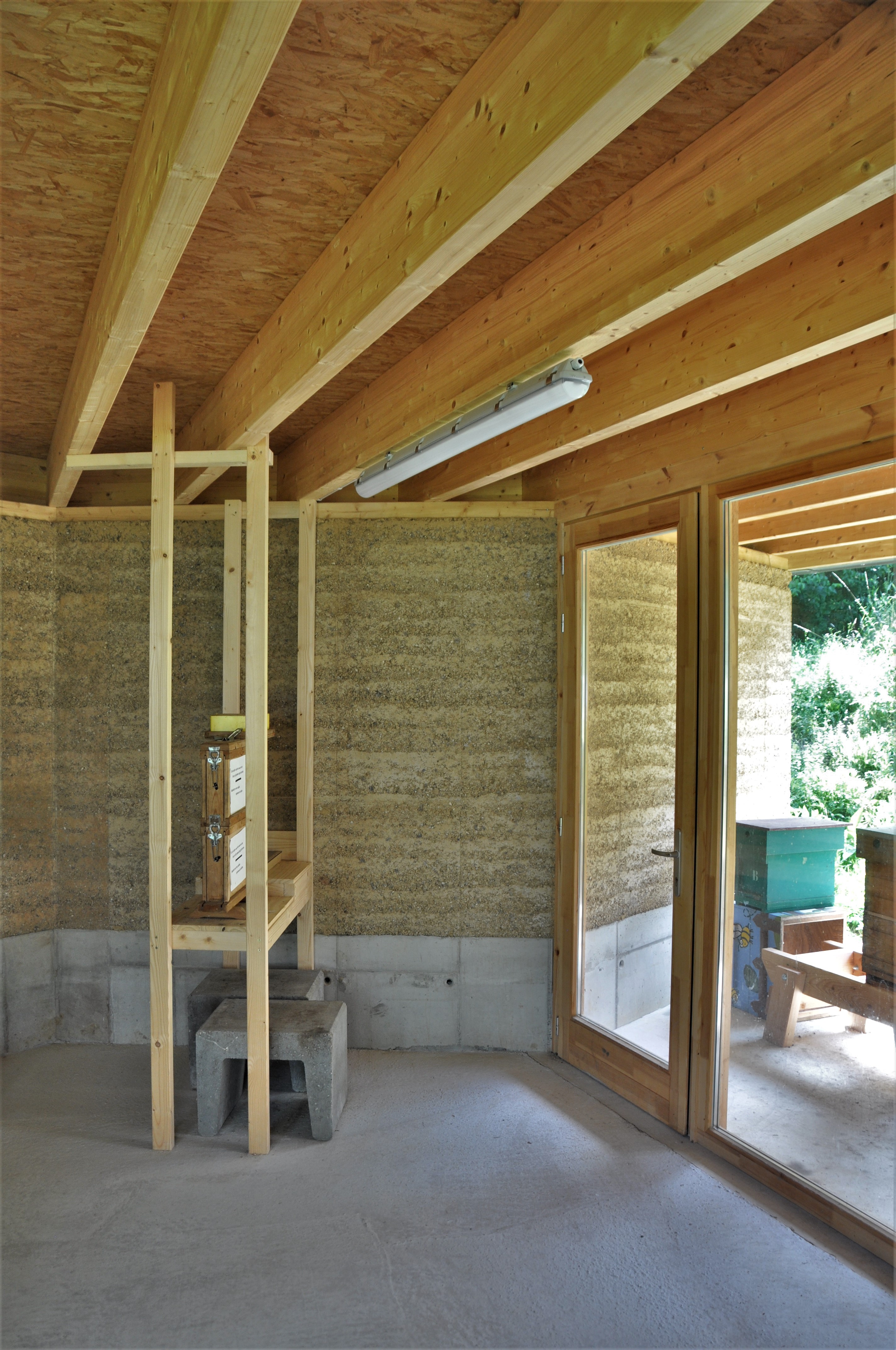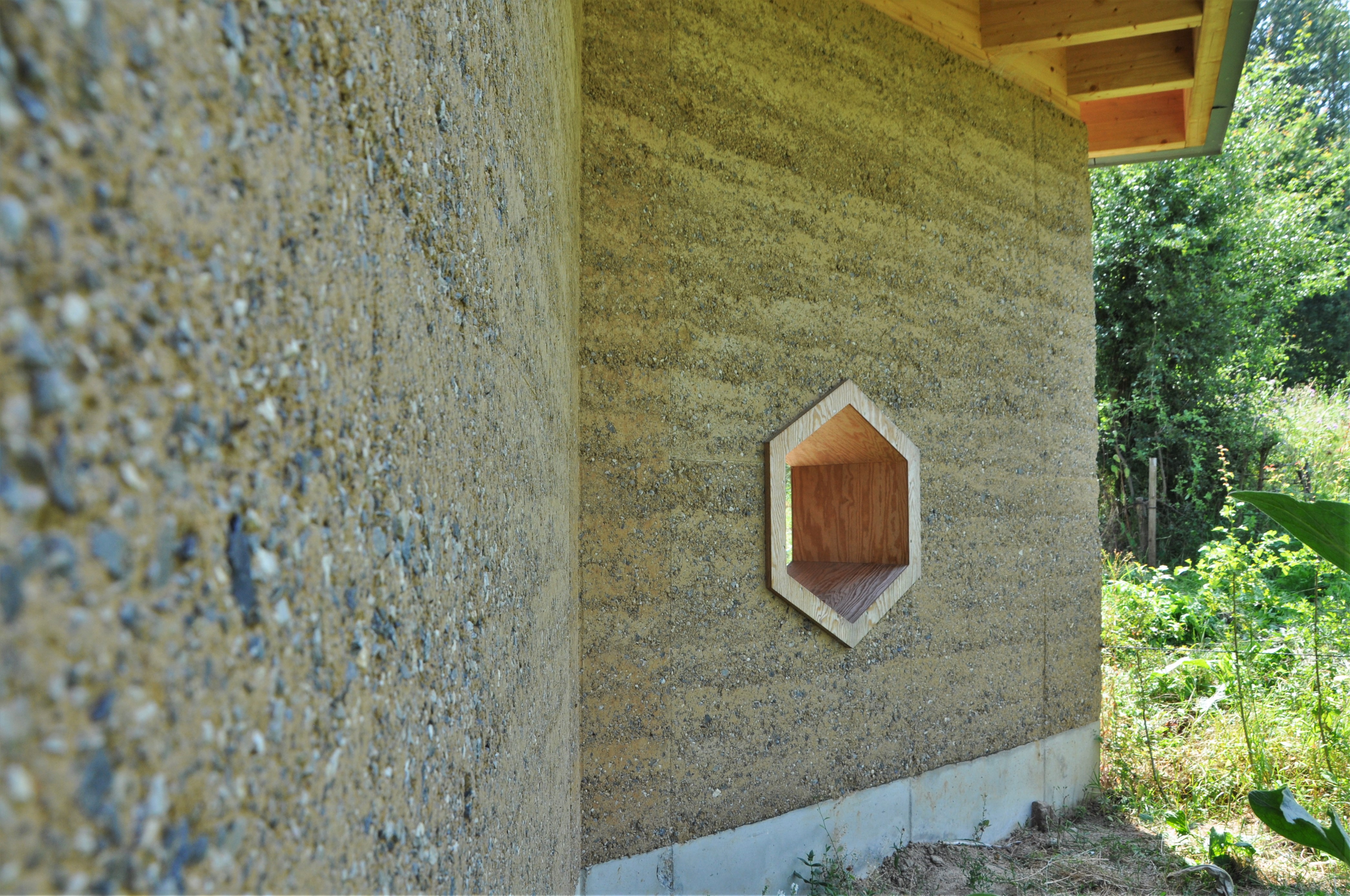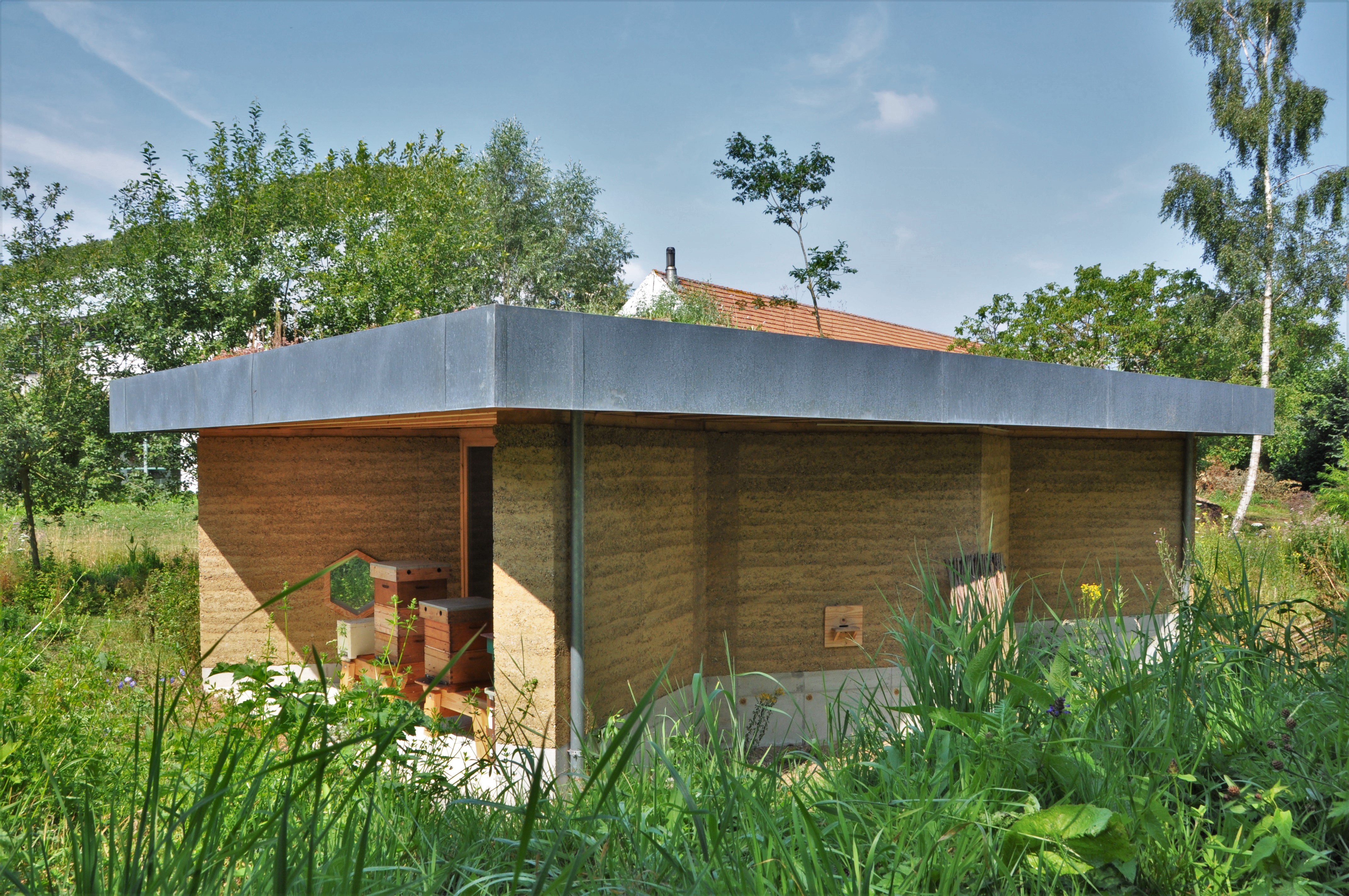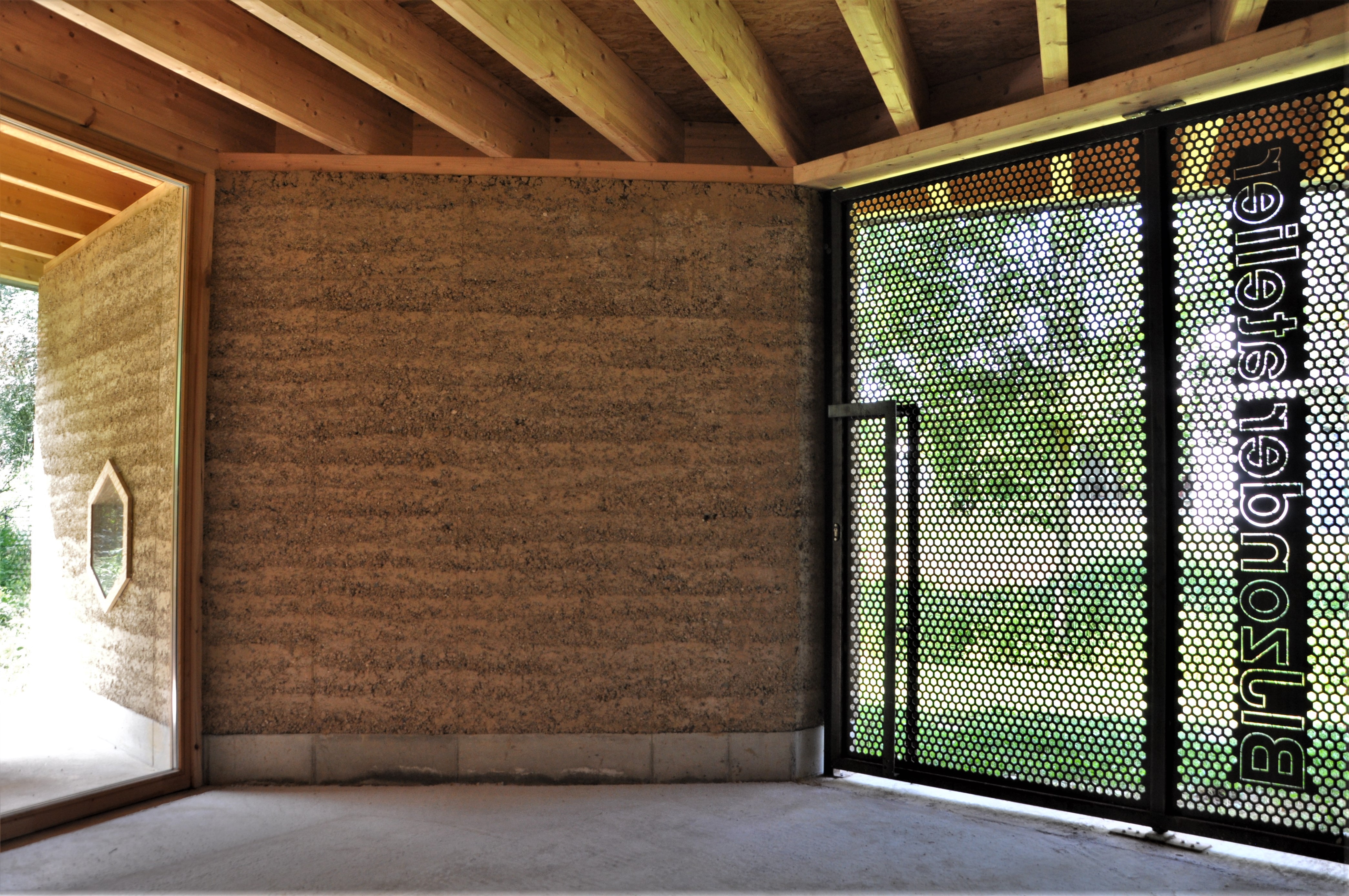 Alle materialen zijn bio-ecologisch. De lemen muren zijn 2,5 m hoog en 40 cm dik. Ken Dupont van Dam Architecten: “de muren zijn in zigzagvorm geplaatst, zoals bij een honingraat, om hun sterkte en draagkracht te verhogen. Er werd nog een cellulose coating op gezet”. De lemen muren dragen een houten dakgebint in gelamineerd vurenhout. Om de windbelasting op te vangen werd het dak met vier stangen verankerd in een betonnen constructie.