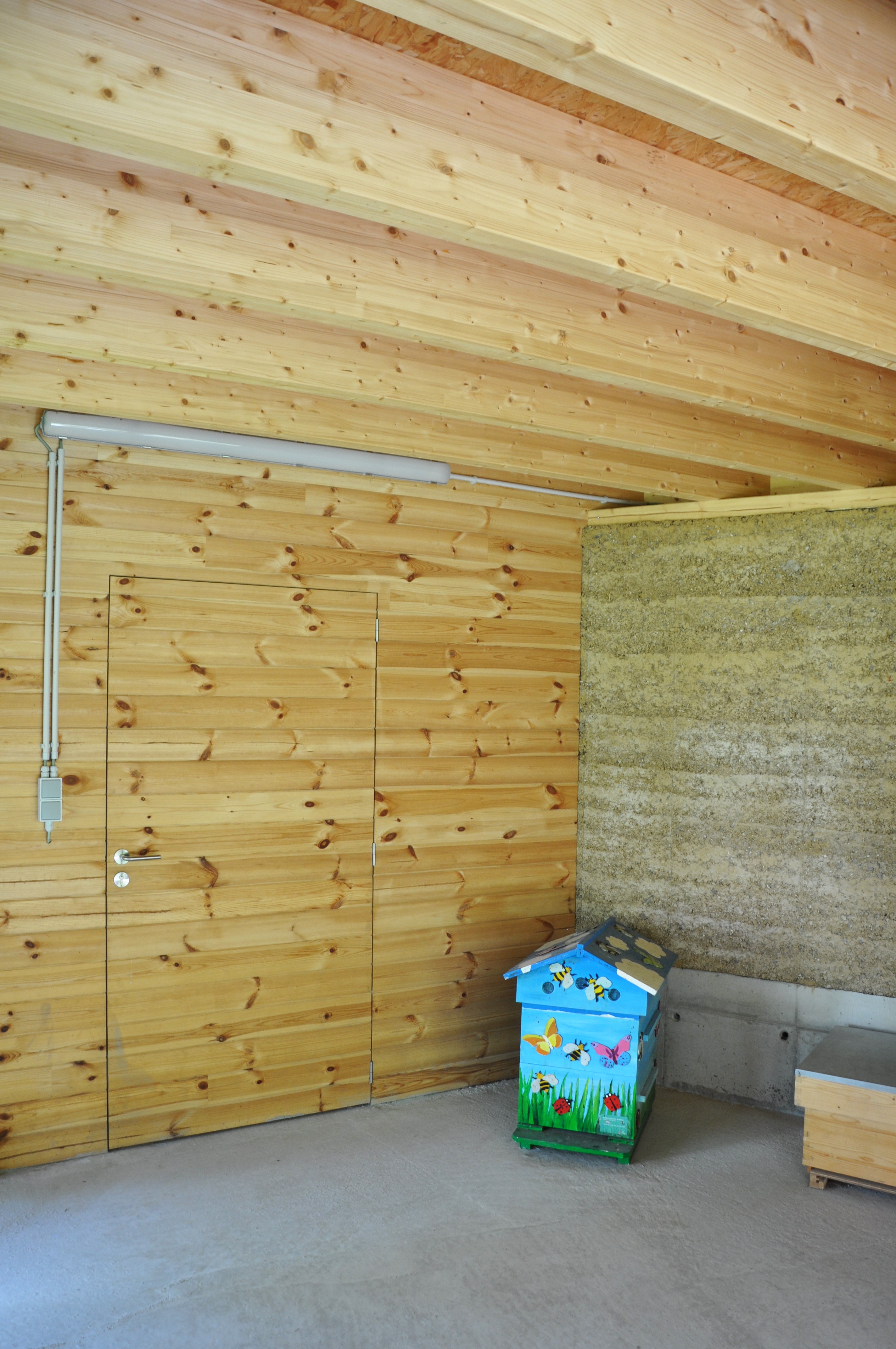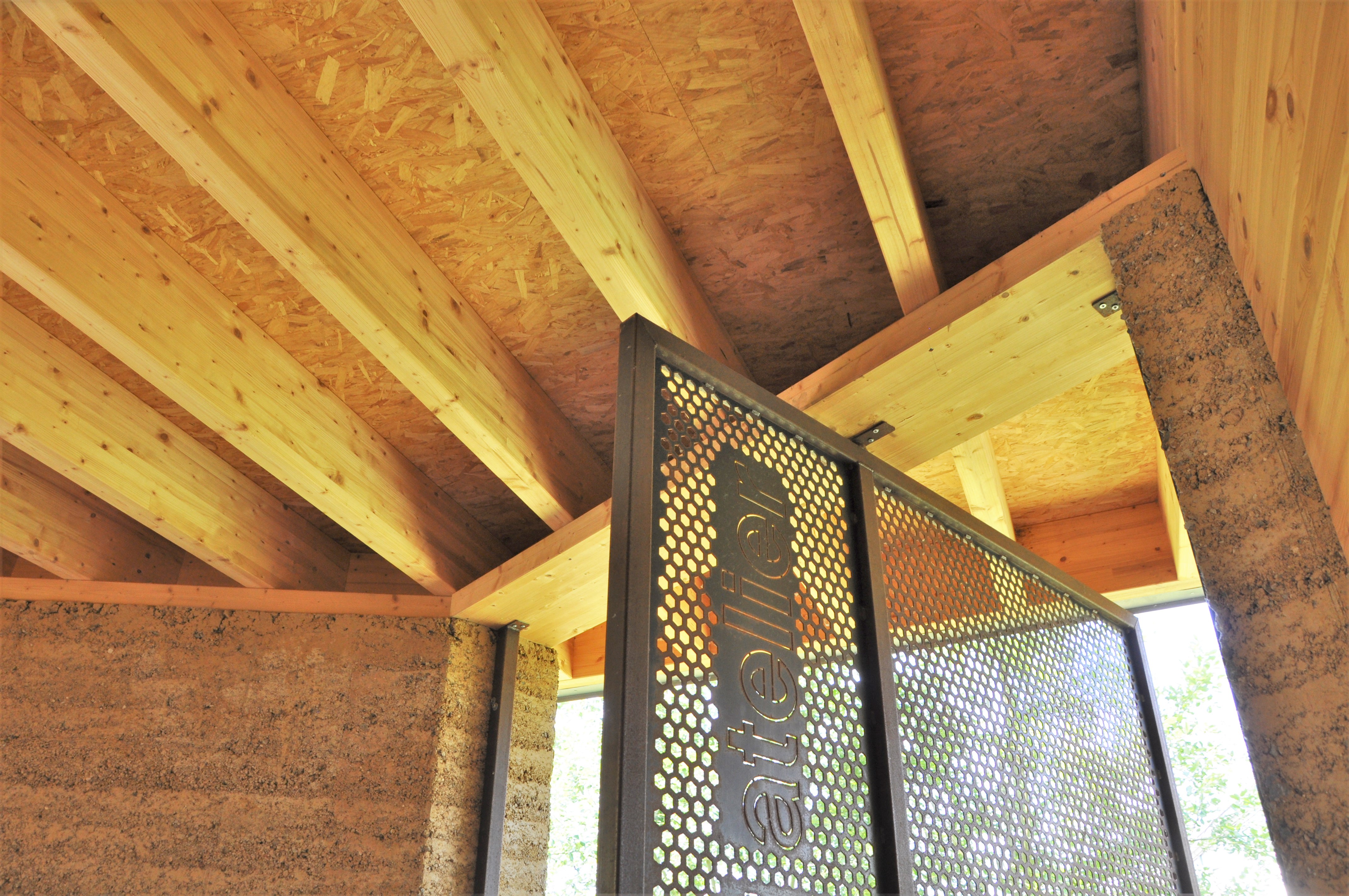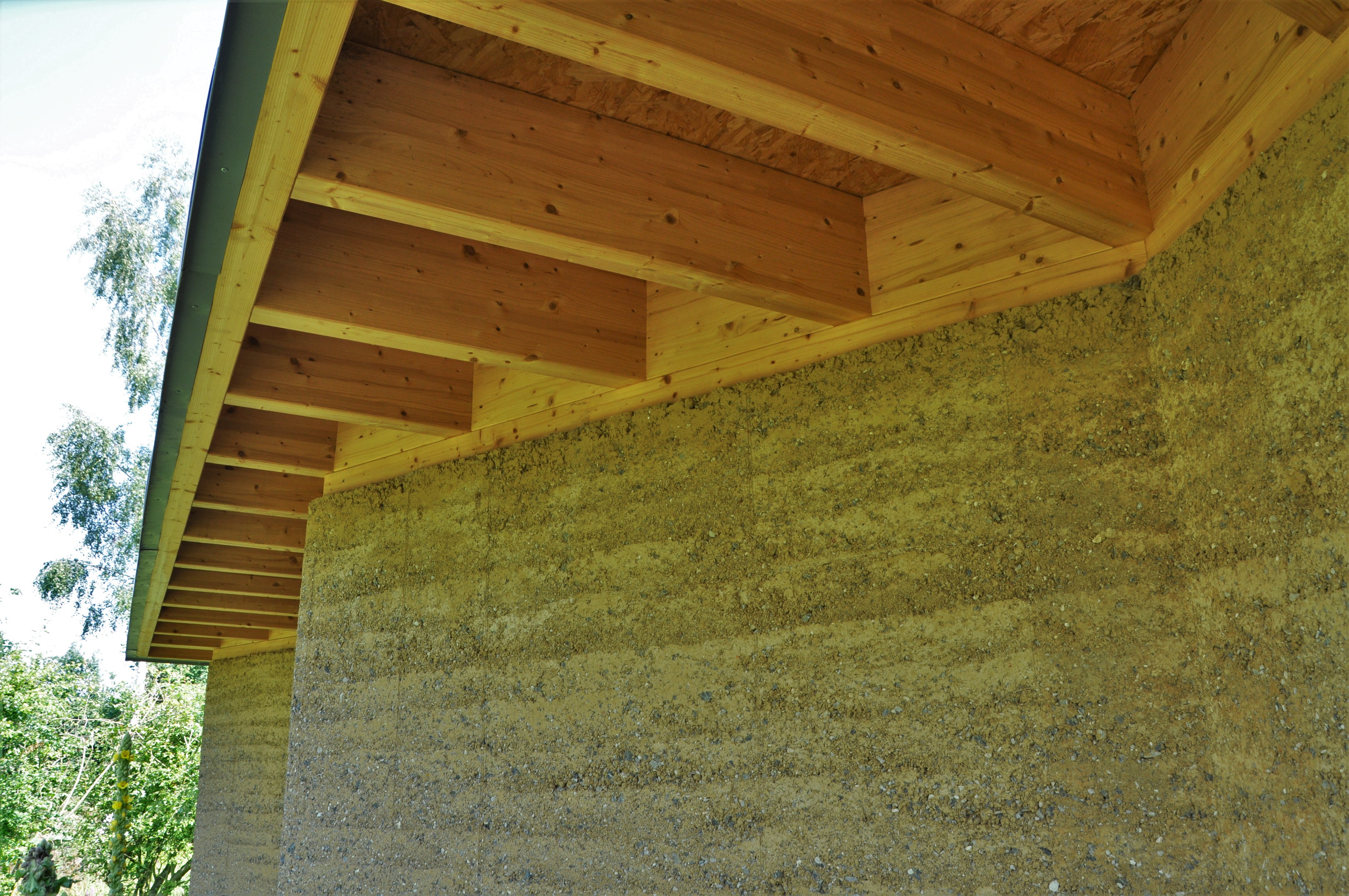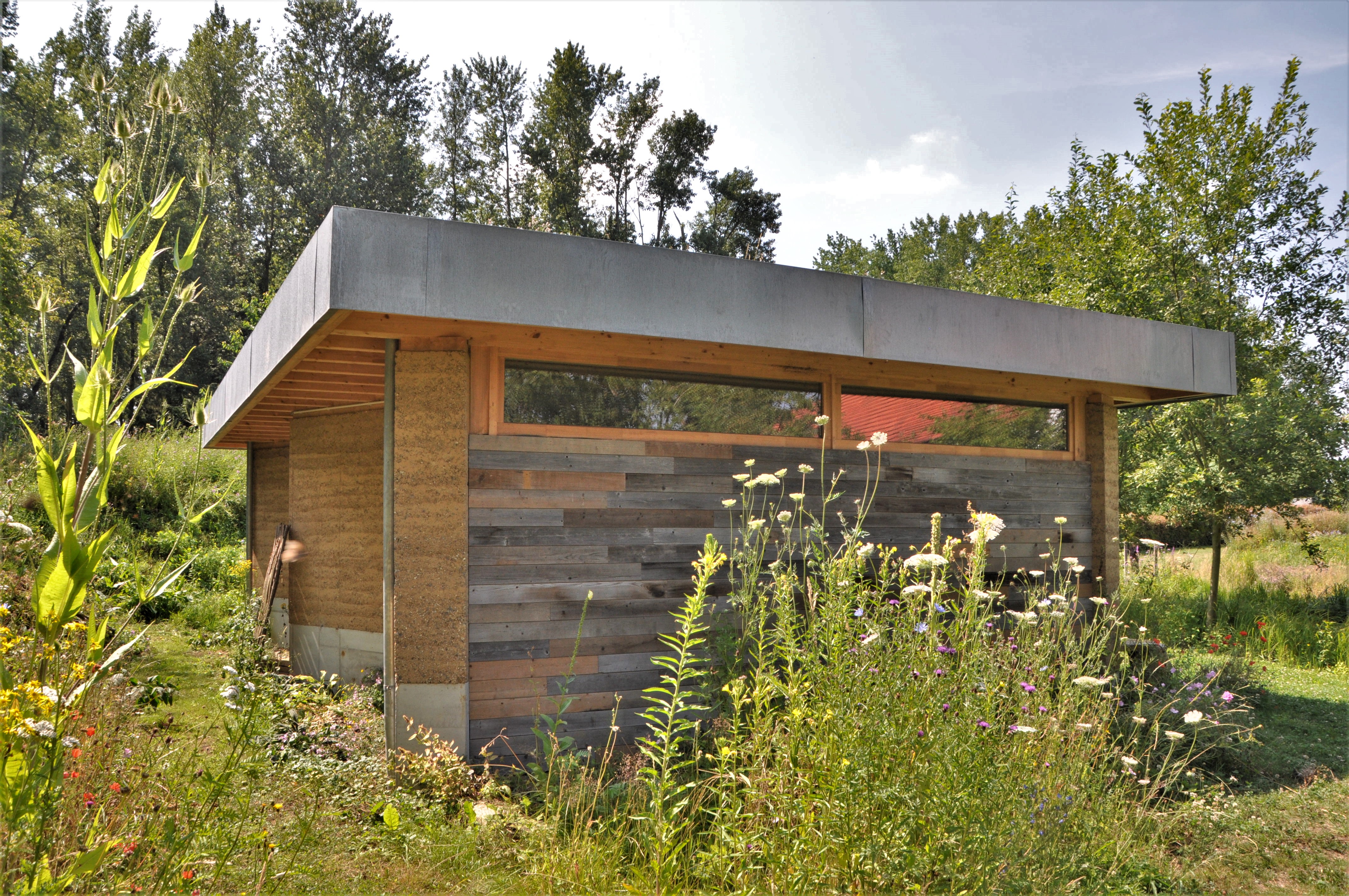 Alle materialen zijn bio-ecologisch. De lemen muren zijn 2,5 m hoog en 40 cm dik. Ken Dupont van Dam Architecten: “de muren zijn in zigzagvorm geplaatst, zoals bij een honingraat, om hun sterkte en draagkracht te verhogen. Er werd nog een cellulose coating op gezet”. De lemen muren dragen een houten dakgebint in gelamineerd vurenhout. Om de windbelasting op te vangen werd het dak met vier stangen verankerd in een betonnen constructie.