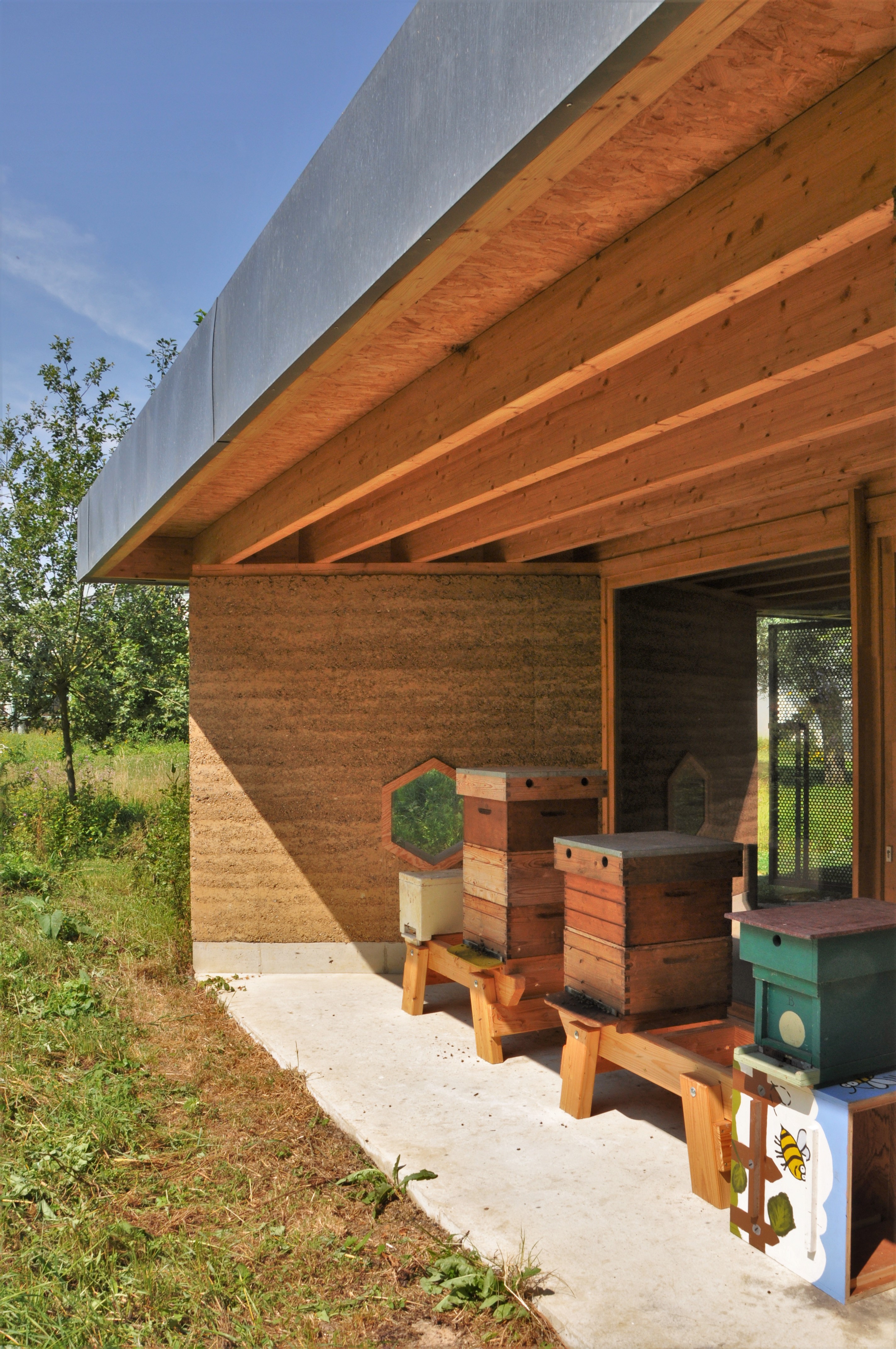 Toelichting Dam Architecten - Naast de bijenkasten en een berging bestaat deze voornamelijk uit een lokaal om schoolkinderen de werking van een bijenkolonie te laten zien. Het moest niet alleen een afdak zijn en beschutting bieden, maar ook een uitnodigend architecturaal element in de tuin zijn, een prikkelende ervaring voor kinderen.