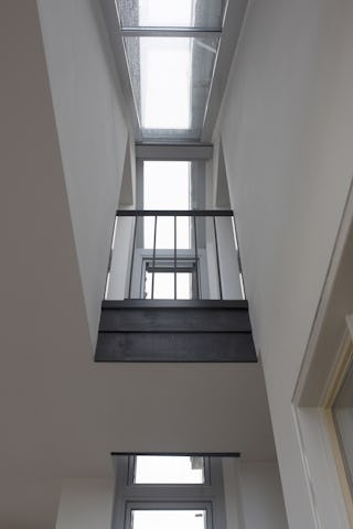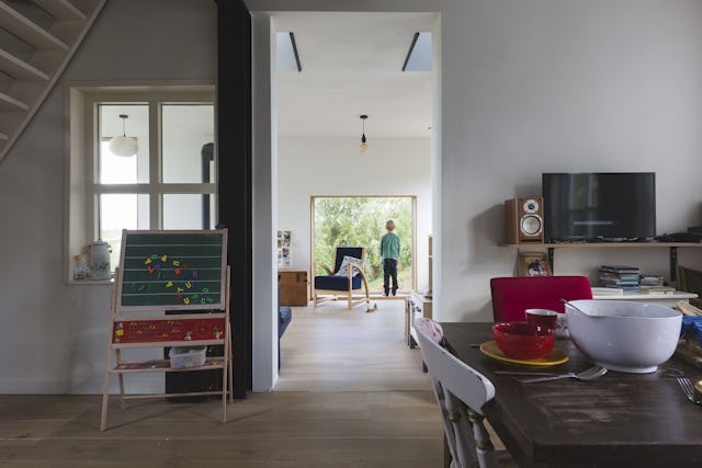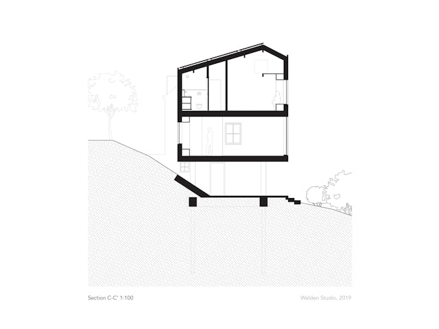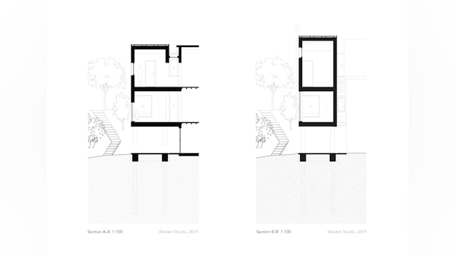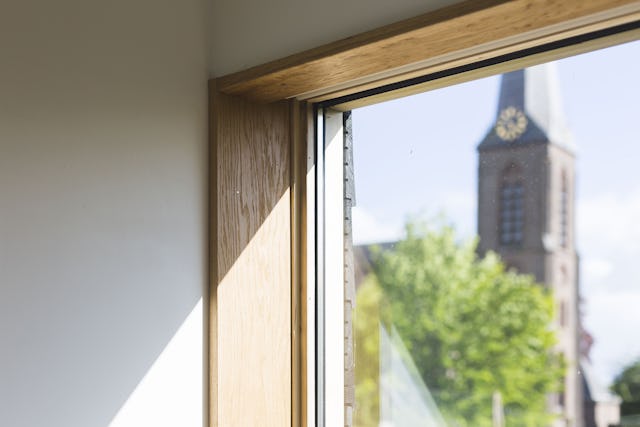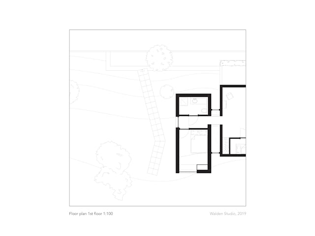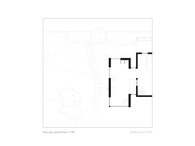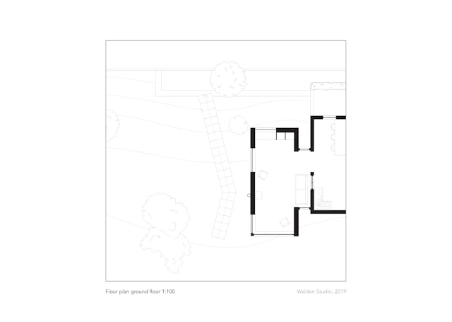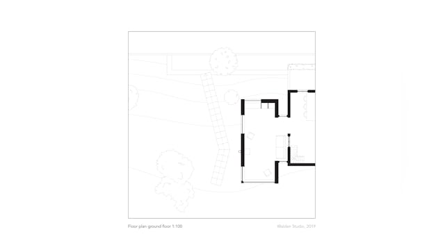 Toelichting door Walden Studio - De wens van de opdrachtgevers was om de bestaande eet- en woonkamer uit te breiden en op de bovenverdieping een badkamer en een slaapkamer voor de ouders te realiseren. Er mocht maximaal vier meter in de breedte worden gebouwd, vanwege het naastgelegen natuurgebied. Daarnaast moest er ruimte gegeven worden aan de rivier die tot aan de winterdijk kan staan bij een overstroming van de zomerdijk.