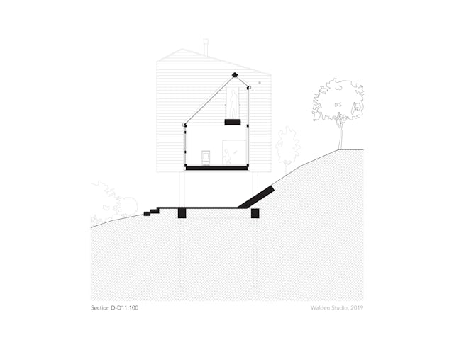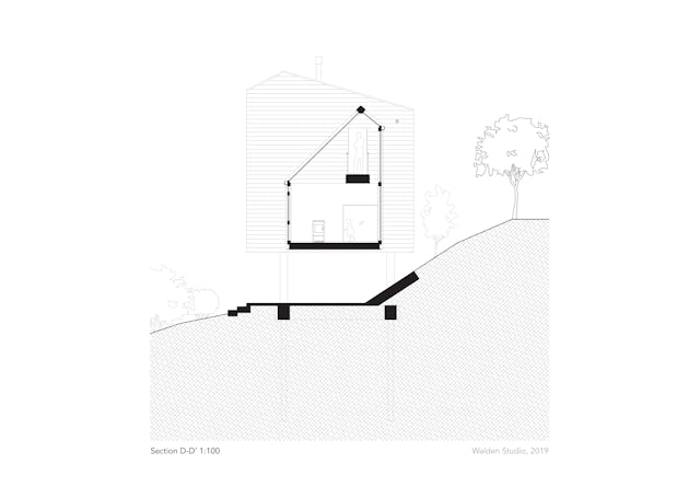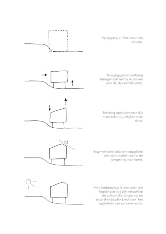 Door de woning op vier poten te plaatsen, staat het ontwerp vrij van de dijk, ook geeft het een extra spanning aan het ontwerp en creëert een overdekte plaats buiten. Het asymmetrische zadeldak is een gebaar in de richting van het weidse uitzicht over de uiterwaarden en een referentie aan historische kapvorm van schuren uit de regio. Tevens creëert het een oppervlak voor zonnepanelen gericht op het zuiden. Aan de straatzijde oogt de uitbouw bescheiden, terwijl vanuit de tuin gezien deze de volle hoogte bereikt en trots uitkijkt over de rivier.