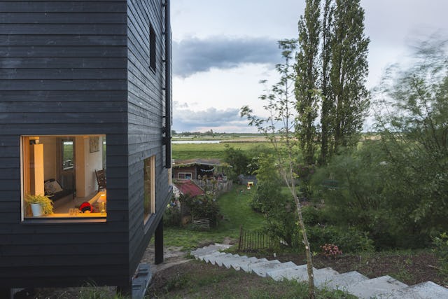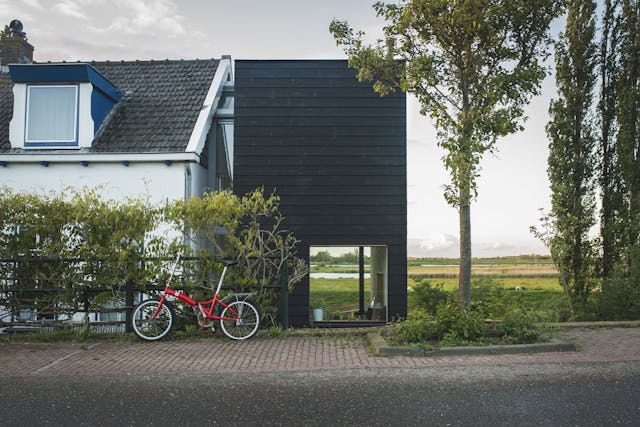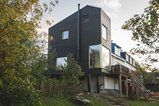 De zwarte gevel is net als de vorm van het dak geïnspireerd op de traditionele zwart geteerde schuren uit de regio. De uitbouw staat op een ‘stalen tafel’ met zwarte buisprofielen als kolommen. Vanaf deze constructieve tafel is vrijwel alles in houtskeletbouw uitgevoerd. Er is met duurzame materialen gebouwd zoals vlasisolatie en onbehandelde accoya kozijnen. De onderkant van de woning is met onbehandelde douglas planken afgewerkt en de gevel met zwart vurenhout.
