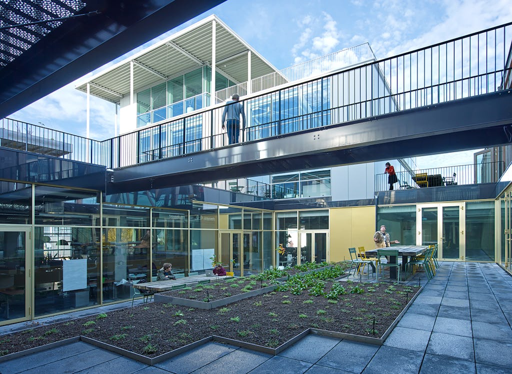 Door de gebouwen te stapelen ontstaat er ruimte voor een gemeenschappelijke tuin; een luxe groene oase in het midden van al het asfalt en beton van het omliggende gebied.