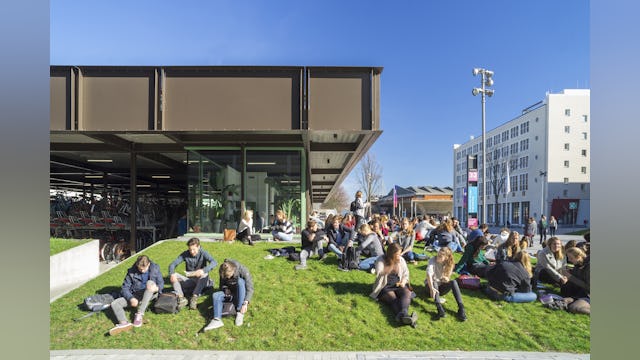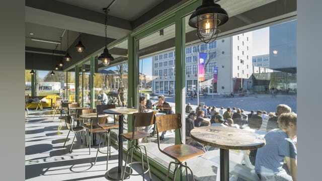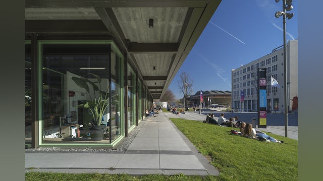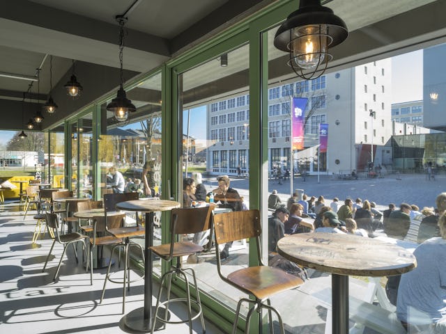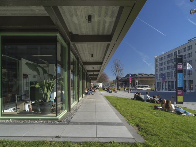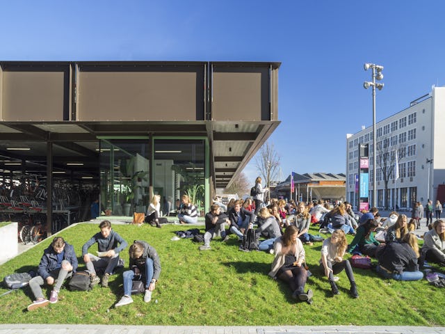 Toelichting Biq-BureauVanEig - De grootste uitdaging in de ontwerpopgave was om van deze grote fietsenopslag een aantrekkelijke verblijfsplek te maken. Door de koffie/werkplaatsvoorziening in een langgerekte en transparante vorm aan het centrale plein te plaatsen op een groene terp en onder een fietsendek krijgt het geheel de uitstraling van een paviljoen met fietsen. Een luie trap richting entree functioneert als zittribune met zicht op het plein. Het dek met stallingen dient als luifel voor de koffiebar en voorkomt opwarming door zoninval in de zomer. Het bestaande transformatorgebouw op de hoek is als baken opgenomen.