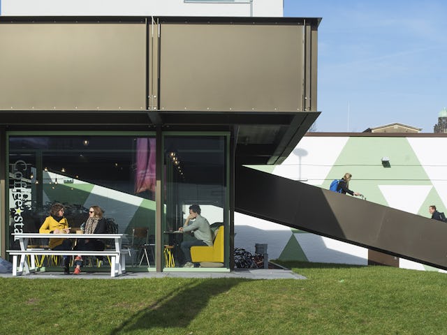 De architectuur van Coffee & Bikes is functioneel en voegt zich daarmee naar de visie van de TU Delft: de uitstraling is in overeenstemming met het gebruik. Het staal is in koffiebruin gepoedercoat, deze kleur vormt een mooi contrast met de grijze gebouwen in de omgeving. De bleekgroene kozijnen geven het gebouw karakter en laten het dek zweven. De constructie van de borstweringselementen is aan buitenzijde geplaatst. Hierdoor krijgt de gevel diepte terwijl de binnenzijde, die de balustrade van het fietsendek vormt, vlak blijft.