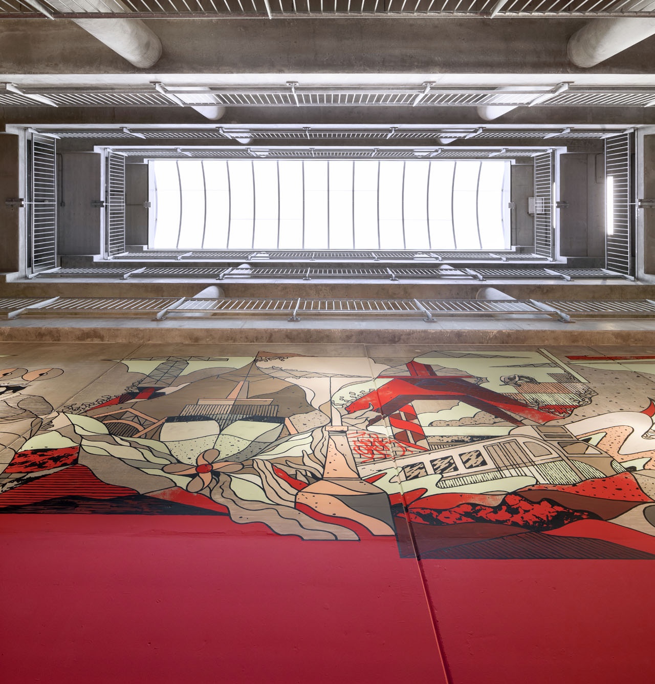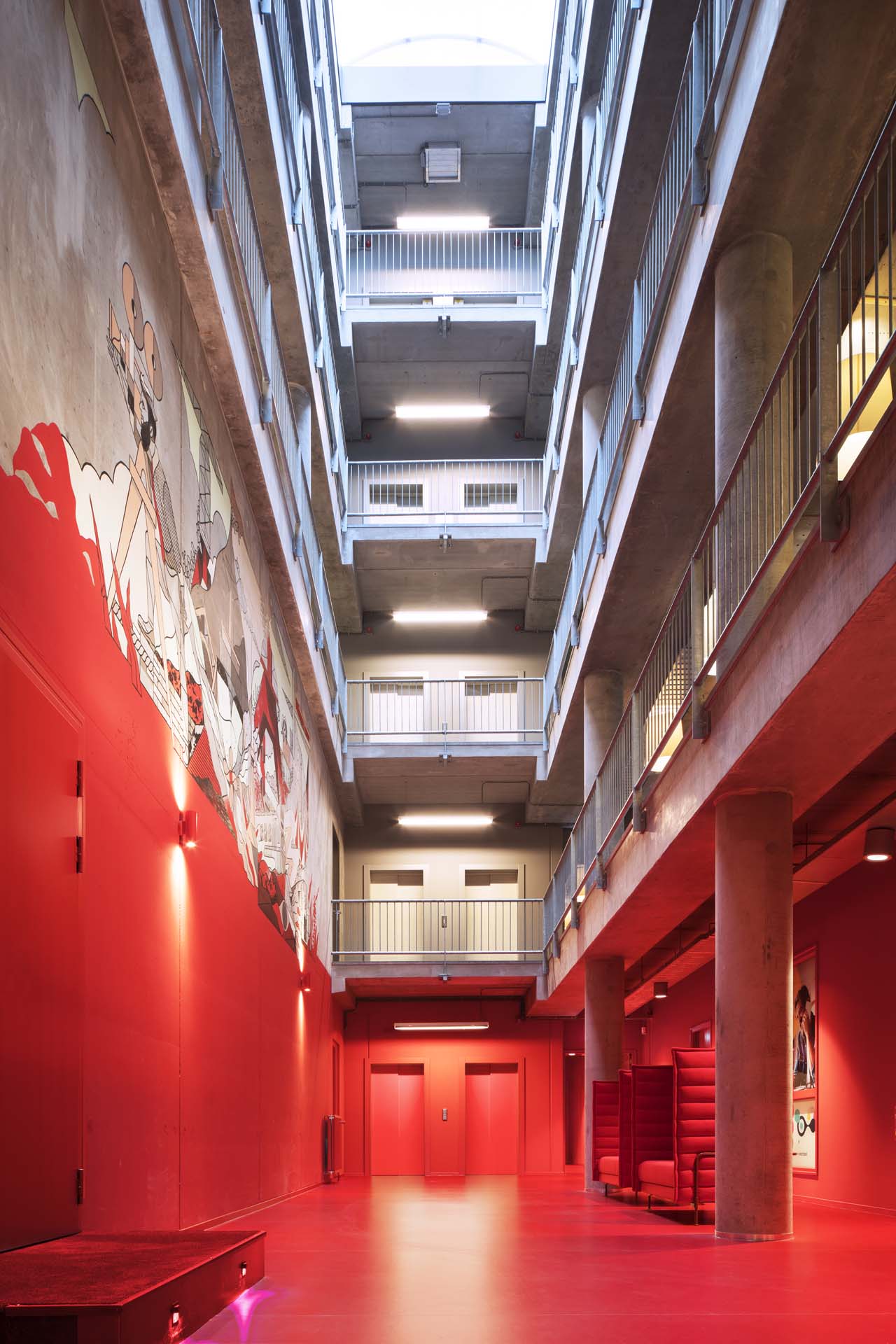 Het jongste bouwdeel bestaat uit een groot atrium met naastgelegen kantoorunits. Het ruwe betonnen interieur is behouden en enkel de aanwezige rode accenten zijn uitvergroot en versterkt. Gelijk aan alle andere ruimtes ontstaat hierdoor één groot gebaar: het volledig rode onderste gedeelte van het atrium. Om het ruwe karakter te versterken is er een groot artwork in het atrium geplaatst, ontworpen door ZenkOne en Artbox. Het artwork vertelt de verschillende thema’s en rijke historie van zowel het gebouw als Amsterdam Noord zelf.