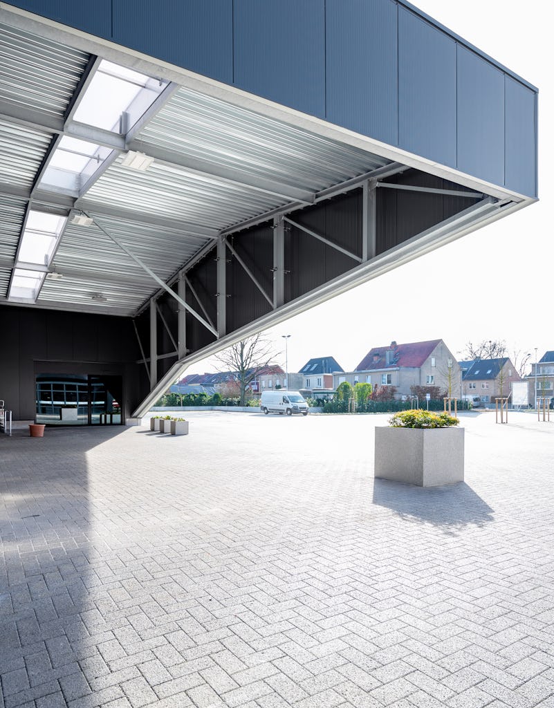 Toelichting Polygoon Architectuur - Het pand kreeg een typisch industriële vorm met een licht hellend dak waarbij de gevel aan de voorkant werd uitgesneden. Die overkraging heeft niet alleen een uitnodigend effect, maar creëert ook ruimte voor de draaicirkel van vrachtwagens die laden en lossen.