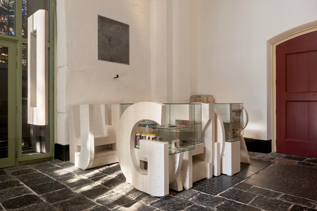 De meubels zijn op dezelfde manier gemaakt, waarbij alle letters individueel zijn uitgefreesd en vervolgens aan elkaar zijn geplakt. In de letters zijn glazen doosjes gezet die in de balie fungeren als vitrines.