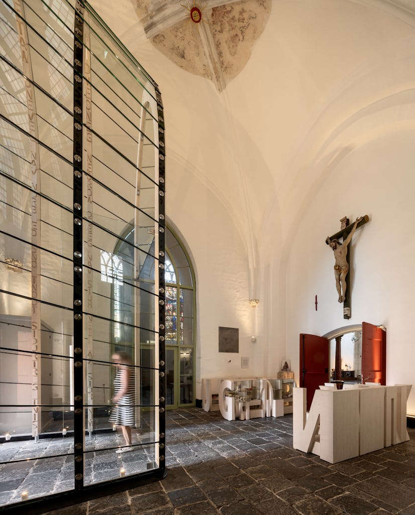 Het basisidee van het portaal is eenvoudig. Vanaf de entree zijn 4 houten spanten geplaatst die de gotische boog van de entree volgen en steeds kleiner worden als je de kerk binnenloopt. De spanten zijn bedekt met grote glazen leien en afgesloten met een glazen deur. In de spanten zijn teksten gefreesd die iets zeggen over de kerkelijke geschiedenis van de kerk. De meubels zijn onder andere gemaakt van het