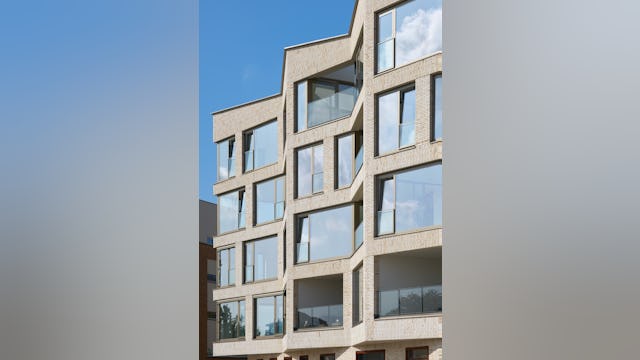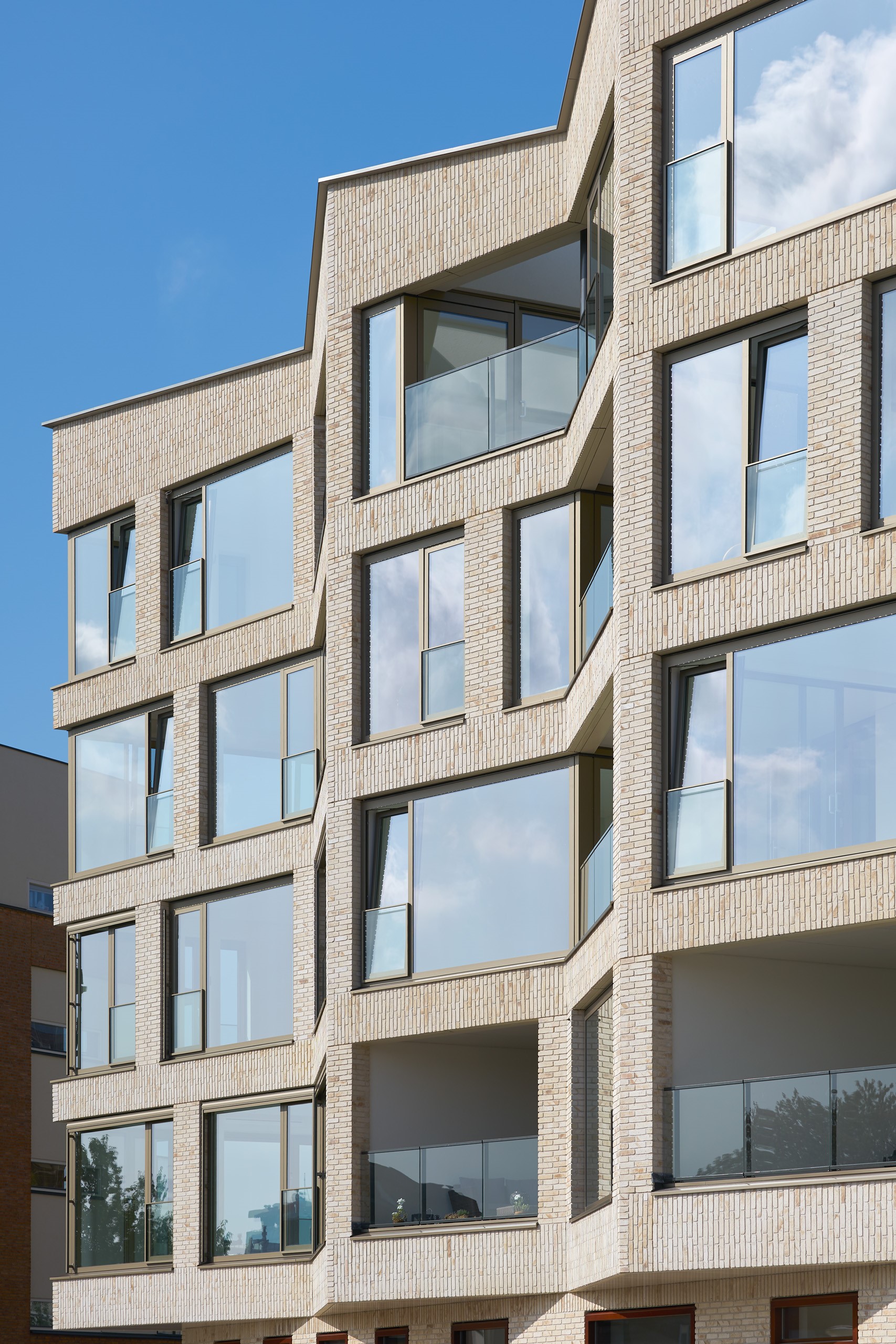 Toelichting VYA / Vera Yanovshtchinsky architecten - Een ‘gevouwen’ metselwerkgevel van ruime erkers en loggia’s omhult een negentiental luxe appartementen, ontworpen op en rond het panoramisch zicht op de oude stad, de kerktoren en het water. Op grote afstand springt de gebouwplastiek in het oog; een verticale opbouw boven een plint, een uitgesproken dakrand en een patroon van wisselend geplaatste gevelopeningen. Van dichtbij wordt het beeld verrijkt door reliëf van staand- en klezoren-verband, detaillering van kozijnen, balustrades en zonwering. Onder invloed van daglicht, weersomstandigheden en positie van waarneming veranderen metselwerkplastiek dakranddetail en de brons geanodiseerde kozijnen en zonweringen van glansgraad, kleur en diepte. De vlakke verhoogde plint, met blank gelakte houten kozijnen en geprononceerd bovenlicht, biedt plaats aan commerciële ruimte en verhoogd aangelegde maisonette-woningen. Voorgelijmde scherpe metselwerk hoeken, neggen en dilataties, kozijnen, balustrades en zonwering zijn met grote precisie gedetailleerd en uitgevoerd. De mogelijkheden van BIM zijn hier optimaal benut.