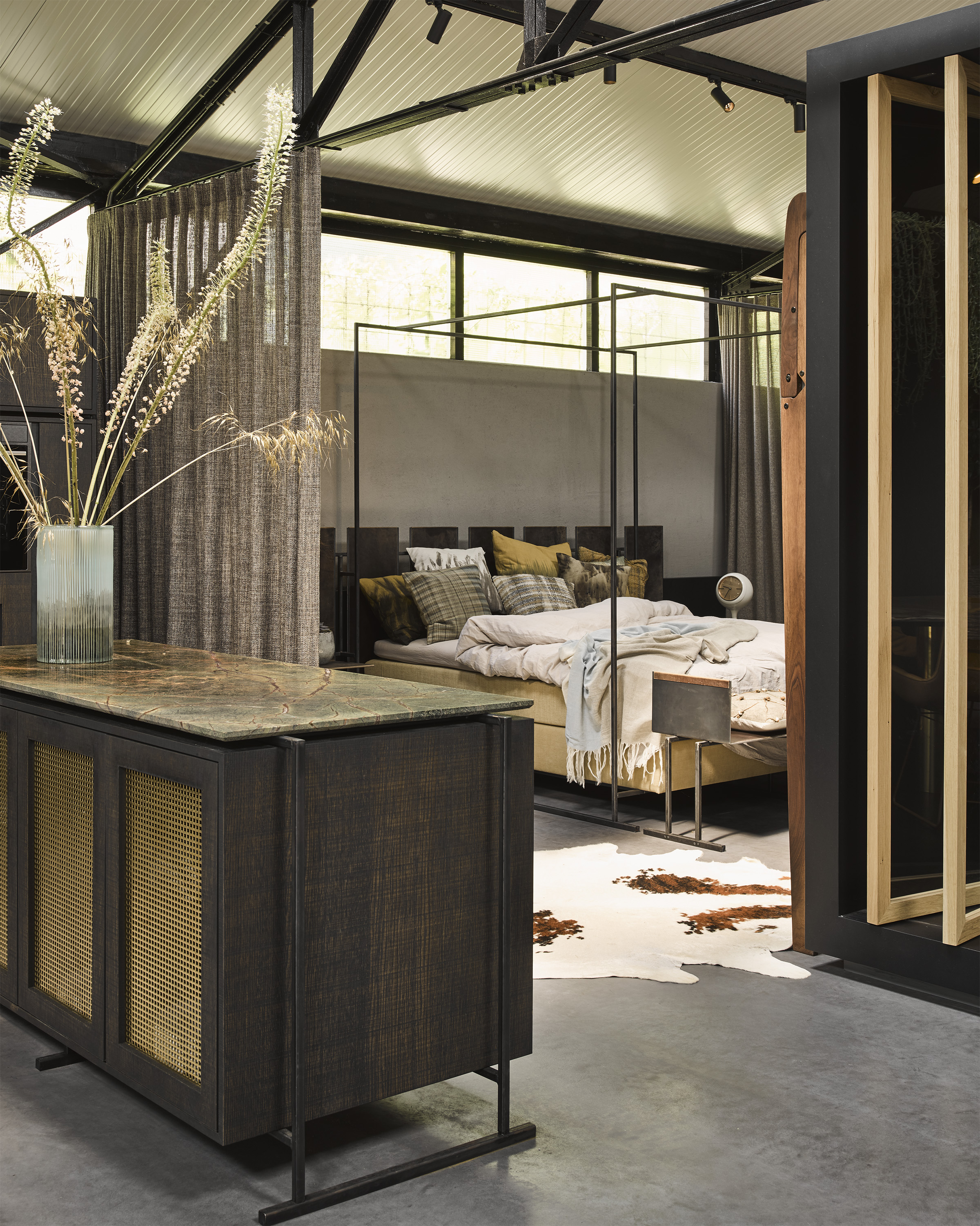 Deze clash is waarnaar gezocht is door Studio Jeroen van Zwetselaar. Een clash van oud en nieuw, warme zware linnen materialen tegenover koud marmer en staal. Met verfijnde afwerking, naast bijna lompe rigoreuze zetten in het vloerplan. Zoals een zwart blok als middelpunt in de ruimte, dwars door de logistieke lijn naar achteren.