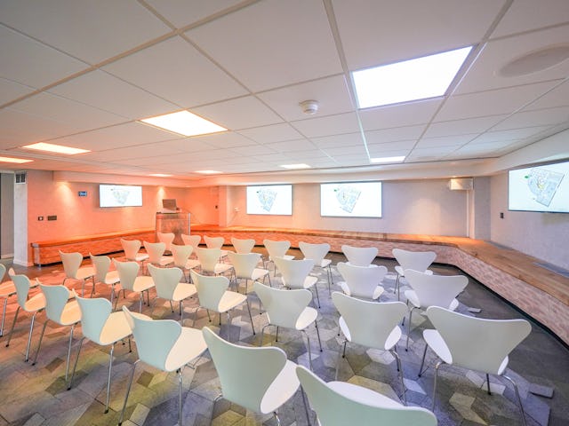 Textiel is een van onze grootste afvalproducten. Door textielvezels met bio-based lijm samen te voegen ontstaat een volledig demontabel en herbruikbaar product: DenimTex. De lijm kan worden opgelost, waarbij de vezels intact blijven. Deze wandbekleding draagt bij aan de goede akoestiek in de ruimte.