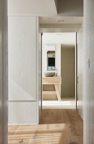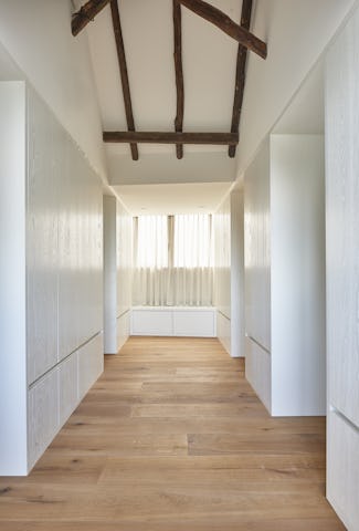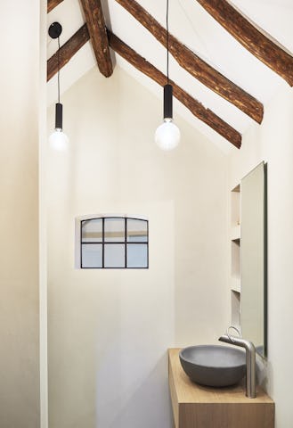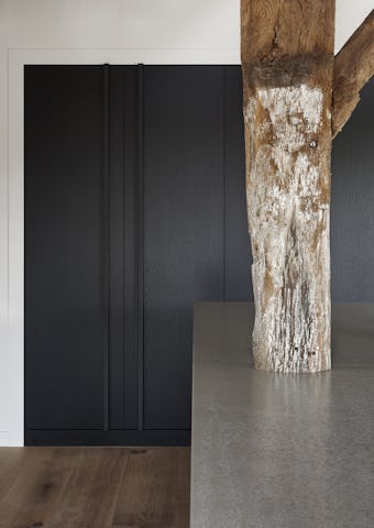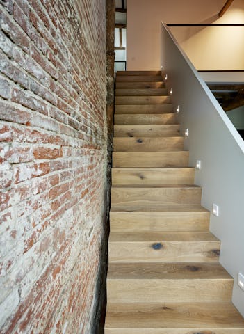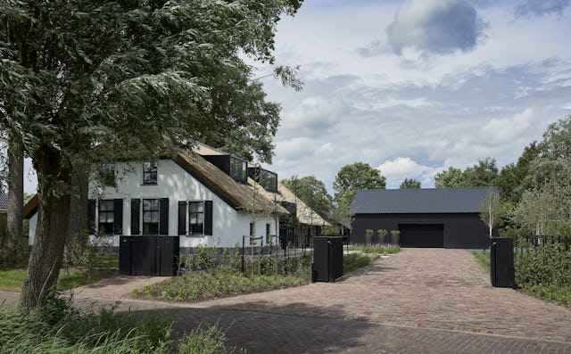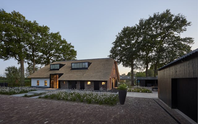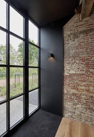 Op de plaatsen waar oud en nieuw elkaar doorkruisen is gekozen voor een minimalistische vormentaal met ranke detaillering. De nieuwe toevoegingen aan de buitengevel zijn hoofdzakelijk uitgevoerd in zwart staal en hout om de tegenstelling met de bestaande elementen te versterken. De authentieke elementen van de monumentale boerderij zijn zo veel mogelijk in ere hersteld, ambachtelijk gedetailleerd en zichtbaar teruggebracht in het ontwerp. Zo is de oude brandmuur ter plaatse van de nieuwe trap weer duidelijk zichtbaar en is de houten kapconstructie in de nieuwe woonkeuken volledig opengewerkt. Door de combinatie van de grondige restauratie en de toevoeging van eigentijdse subtiel gedetailleerde elementen is het geheel getransformeerd tot een prachtige familiewoning.