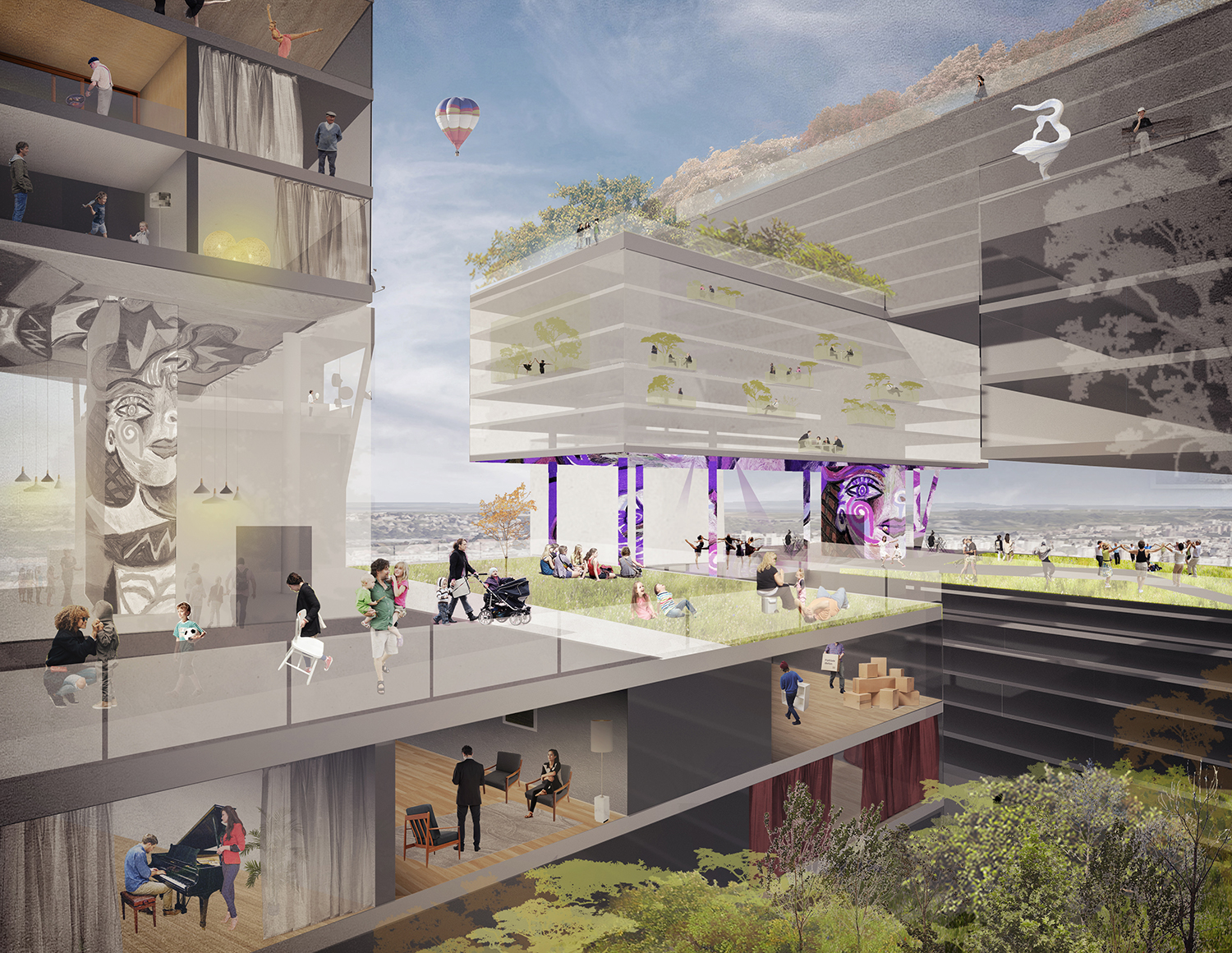 Toelichting NOAHH | Network Oriented Architecture - Onze studie voor het Nieuwe Žižkov Centrum in Praag is onderdeel van een groter verdichtingsproject en bevat 1200 appartementen en 110.000 m2. Onze aanpak is gebaseerd op voortzetting van de geschiedenis van de plaats, waar de iconische Cetin telecommunicatietoren, gebouwd in de jaren 70 en ooit het hoogste gebouw in Tsjechië, evenals aangrenzende gebouwen, kan worden behouden. Door middel van een aantal strategische interventies kan het worden omgezet in “het gebouw als verticale stad” door het gebouw op te toppen en bovenop het bestaande gebouw functies toe te voegen.