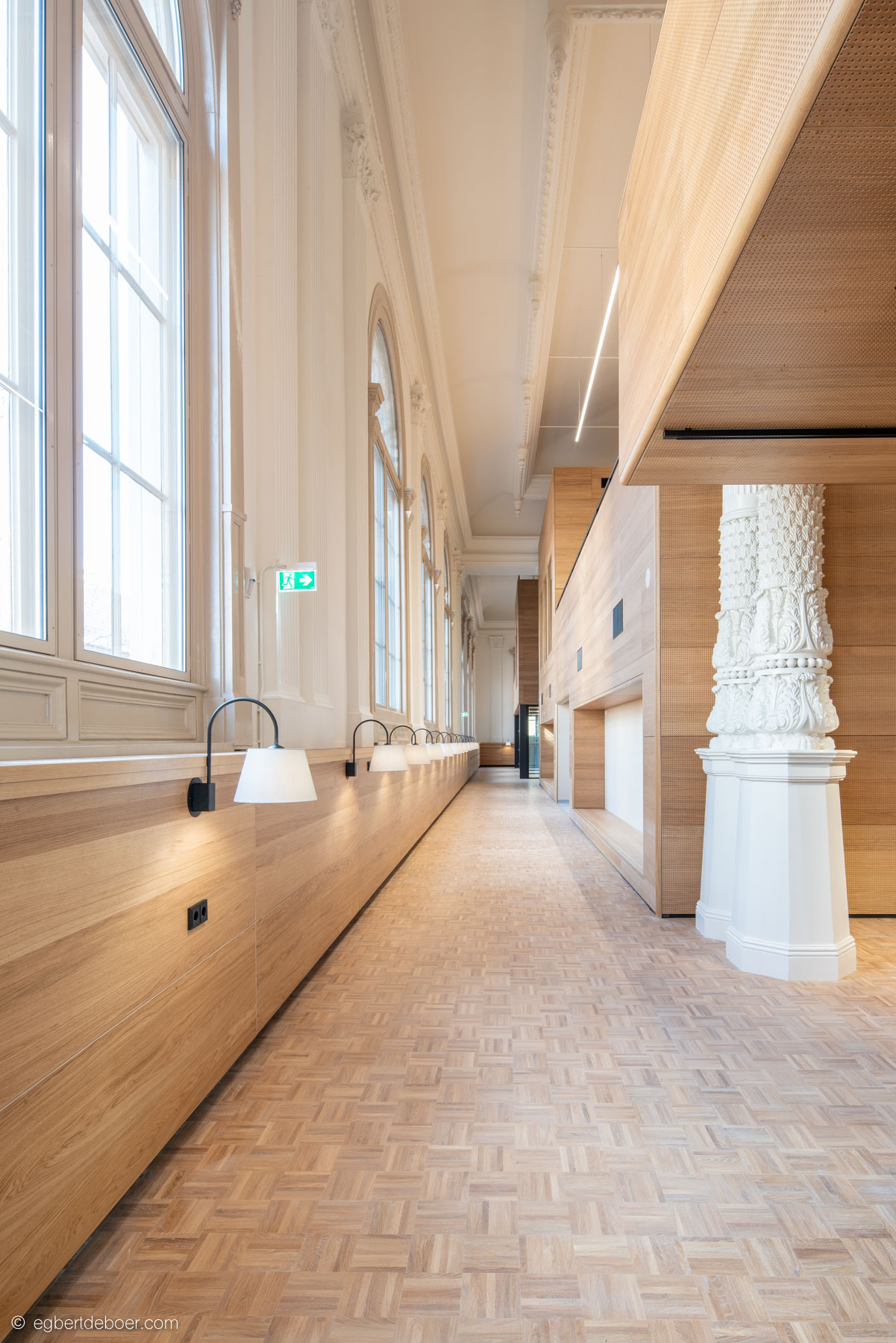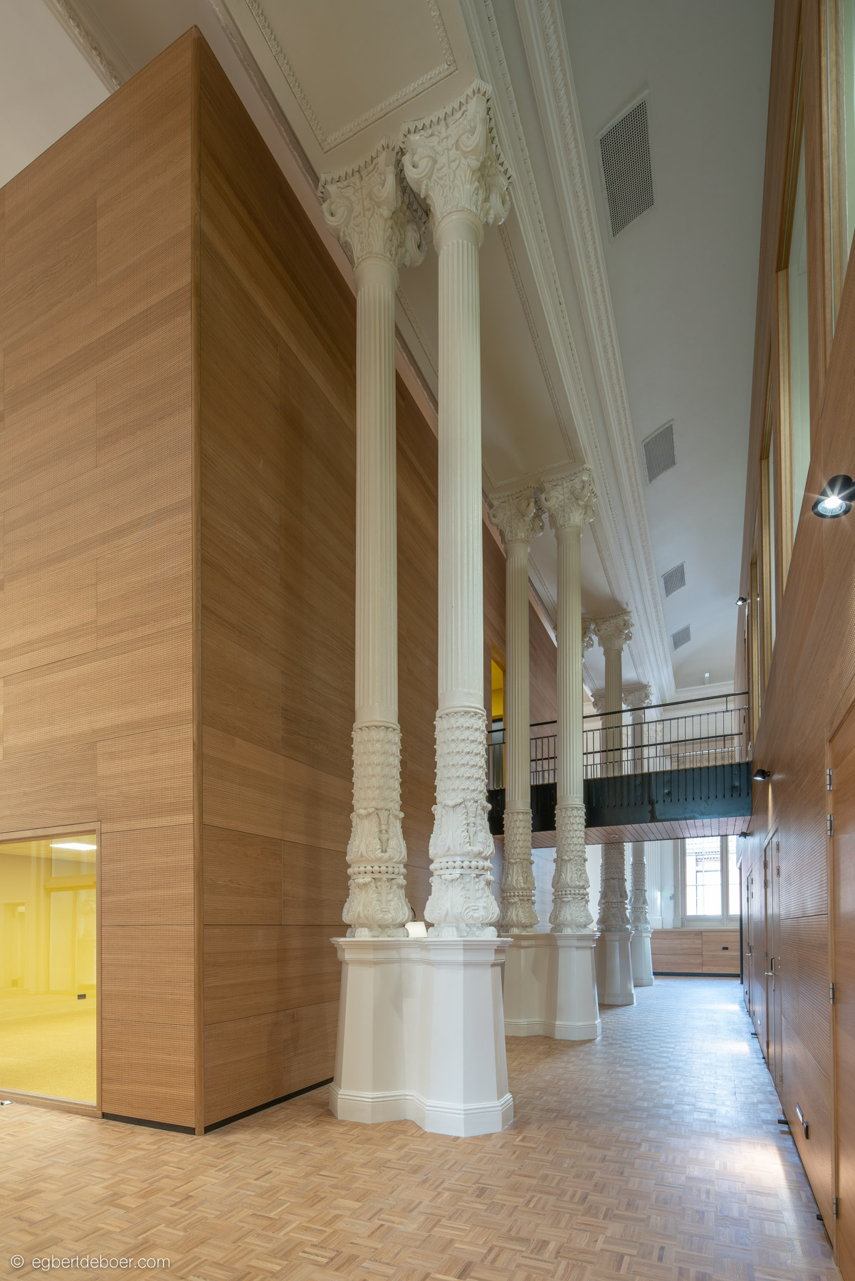 De ombouw tot bibliotheek had destijds op de begane grond het originele beeld uitgewist door systeemplafonds en een nieuw hoofd-trappenhuis. Wij hebben ons ontwerp gericht op het oorspronkelijke karakter van de beurs.