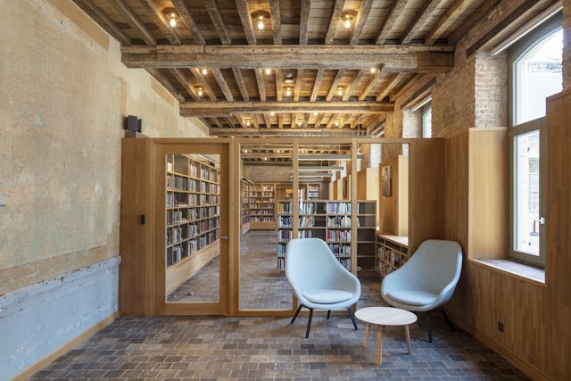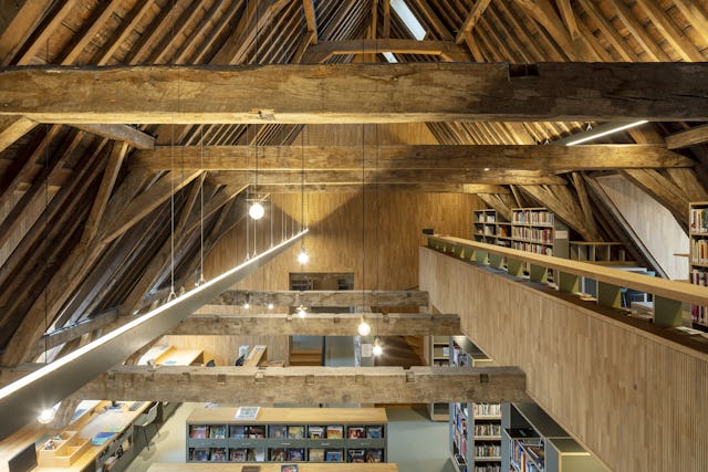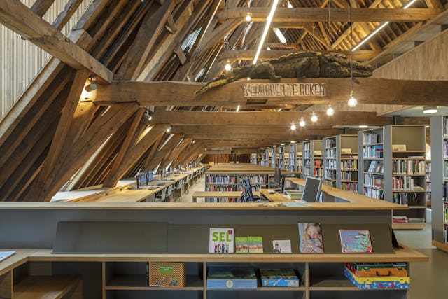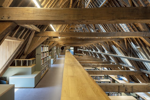 De indrukwekkende zolderruimte vormt het hoogtepunt van het gebouw. Met haar monumentale houten constructie bleek deze ruimte vol verhalen en associaties ideaal voor een bijzondere kinder- en volwassenenbibliotheek. Voor extra daglicht, lucht, uitzicht en als rook-warmte-afvoersysteem zijn verschillende dakkapellen en dakramen toegevoegd. Het interieur bestaat uit volledig op maat gemaakt meubilair, verfijnde verlichting, eikenhouten lambriseringen en de bijzondere materialen, texturen en kleuren die tijdens een nauwkeurig proces van restaureren, reinigen en fixeren zijn ontdekt en geconserveerd.