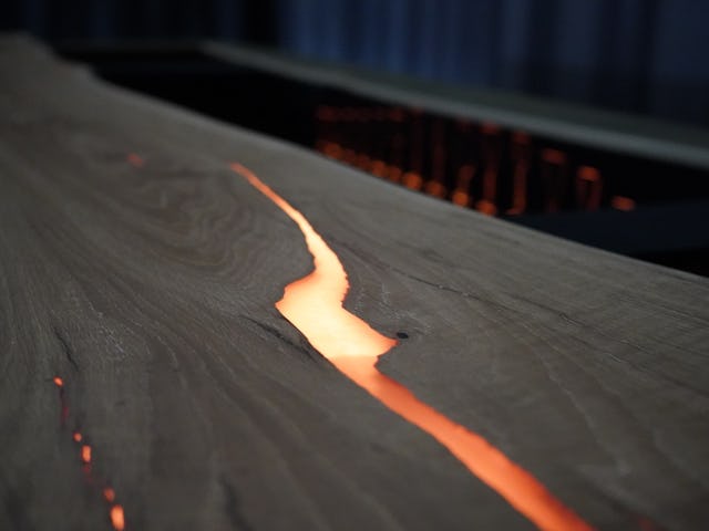 Toelichting architect - De twee schaaldelen vormden samen de mogelijkheid om een dressoir te ontwerpen. Het meubelstuk bestaat uit een lade uit één stuk en een verassing onder het openschuivende bovendek. Het ontwerp kwam tot stand doordat de scheuren in de buitenschaaldelen werden bewerkt met een lichtdoorlatende epoxy. Deze epoxy gaf mij nieuwe mogelijkheden om toe te passen.