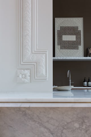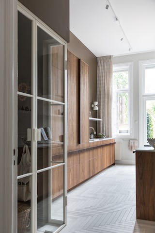 Toelichting door Avenue Design Studio - De keuken moest eigentijds en ‘warm’ worden met extra aandacht voor kwalitatief hoogwaardige materialen en apparatuur met ultieme functionaliteit. Onze visie voor deze lange, smalle ruimte was om de kasten als 'meubels' te laten aanvoelen. Daardoor zouden we niet het effect hebben van samengestelde kastjes die de ruimte 'volproppen' maar van mooi ontworpen meubelstukken die met elkaar een synergie vormen en die verbonden zijn door gezamenlijke elementen als de op maat gemaakte grepen en blad ('The whole is greater than the sum of its parts'). Materialiteit is voor de studio een belangrijke kernwaarde. Conceptueel wilde we in deze keuken, en de rest van het huis, zo veel mogelijk tastbare elementen creëren. Naast het rustige kleurenpalet is de detaillering zo sterk dat je er aan zou willen voelen, in sommige gevallen voel je het voordat het visueel opvalt; zoals bij de keukengrepen, de randen van de planken.