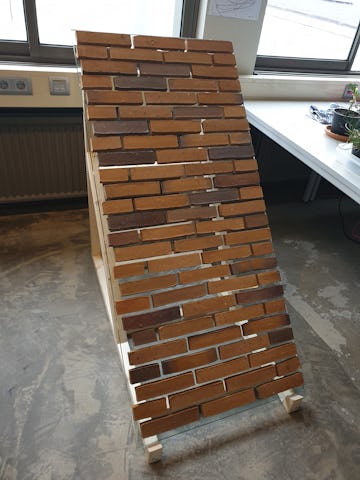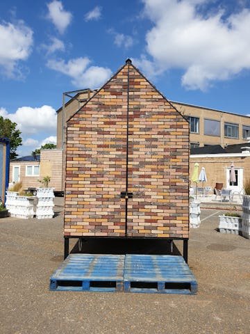 Ons brein vult in. We denken te weten wat we zien. Als we bakstenen zien, verwachten we dat ze gemetseld zijn en dat zien we dan ook. Ook bij de Floating Bricks zie je in eerste instantie een gemetselde muur. Als je dichterbij komt blijken er geen voegen te zijn terwijl geen enkele steen elkaar raakt. Elke steen zweeft in de lucht, maar toch vormen ze samen die solide gemetselde muur. We maken een gevelelement, die de illusie wekt van een gemetselde muur, maar transparant blijkt te zijn. Met dit principe bouwen we een archetype huisje van 2x3 meter met een dakje onder 45 graden. Het huisje staat op pootjes en zweeft