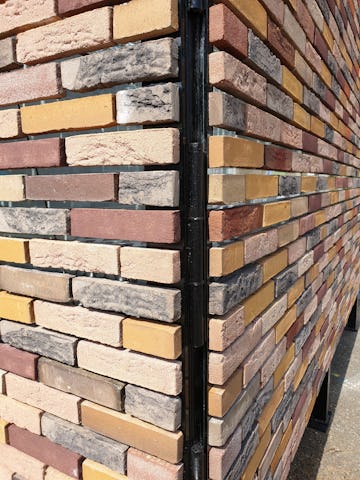 Met de Floating Bricks combineren we twee van deze reststromen, enerzijds het glas van Qbiq dat na het versnijden van de jumbo platen tot hun modulemaat overblijft, anderzijds overgebleven steenstrips van Wienerberger.