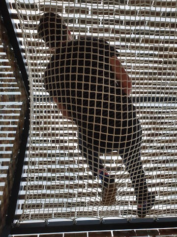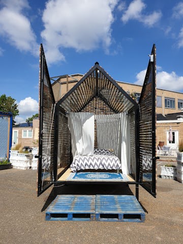 Temidden van de Floating Bricks staat in het huisje een tweepersoonsbed en onder het dak is een net gespannen waarin je kun liggen. De kop van het huisje kan volledig open. De lijmdotten waarmee de stenen bevestigd zijn op het glas, tekenen zich af als een jaren zestig behang en geven het interieur een warme huiselijke sfeer.