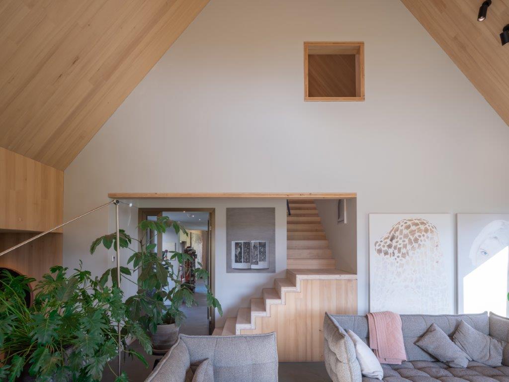 De twee lagere volumes hebben de vorm van typische puntschuren die rechtstreeks zijn verbonden met de omliggende tuinen. Het hogere volume vangt het zicht op het brede landschap en vormt een opvallend contrast met de lagere gebouwen. Het hoogste element, het meest prominente gebouw, bevat de hoofdslaapkamer op de begane grond, kinderkamers op de bovenste verdiepingen en een dakterras aan de bovenkant. Van de twee schuren is er een ingericht als woonkamer, keuken met eethoek en een grote veranda aan de zuidwestkant, met een werkruimte en een speelkamer op de eerste verdieping.