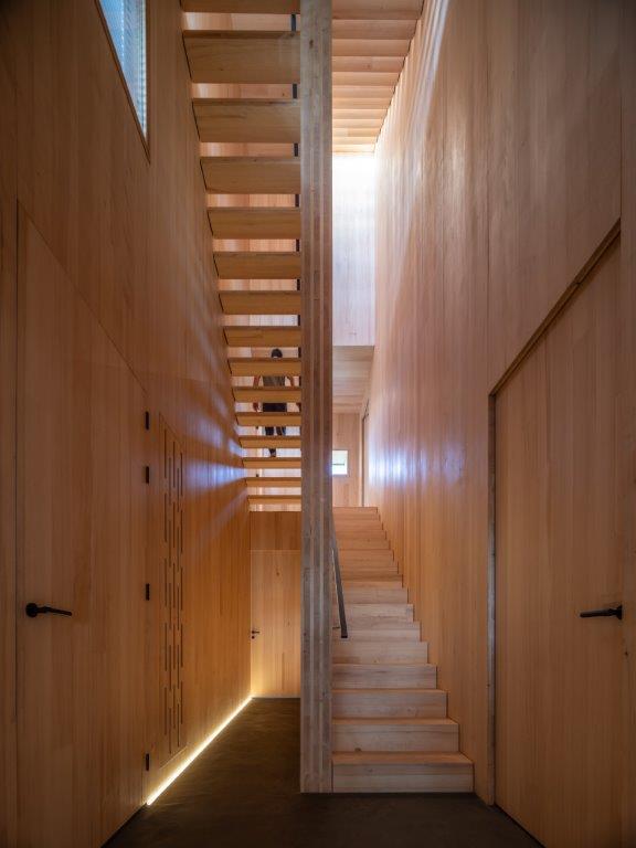 Hout wordt gebruikt voor zowel de structuur als de interieurafwerking, een materiaal dat tegelijkertijd duurzaam en visueel warm is. De drie gebouwen hebben een gelamineerde houtstructuur en Europese zilveren sparren binnenoppervlakken, een houtsoort met een uitzonderlijk gladde en uniforme textuur. In vergelijking met andere solide constructiemethoden is er relatief weinig energie nodig voor de productie en verwerking van dwarsgelamineerd hout.